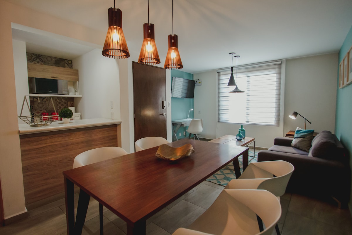 Disfruta de lo acogedor de este alojamiento tranquilo y céntrico, a dos cuadras de centro de convenciones y feria. Ubicado en primer piso de conjunto habitacional privado con cajón de estacionamiento en frente del depto. Hermoso mobiliario y acabados.
