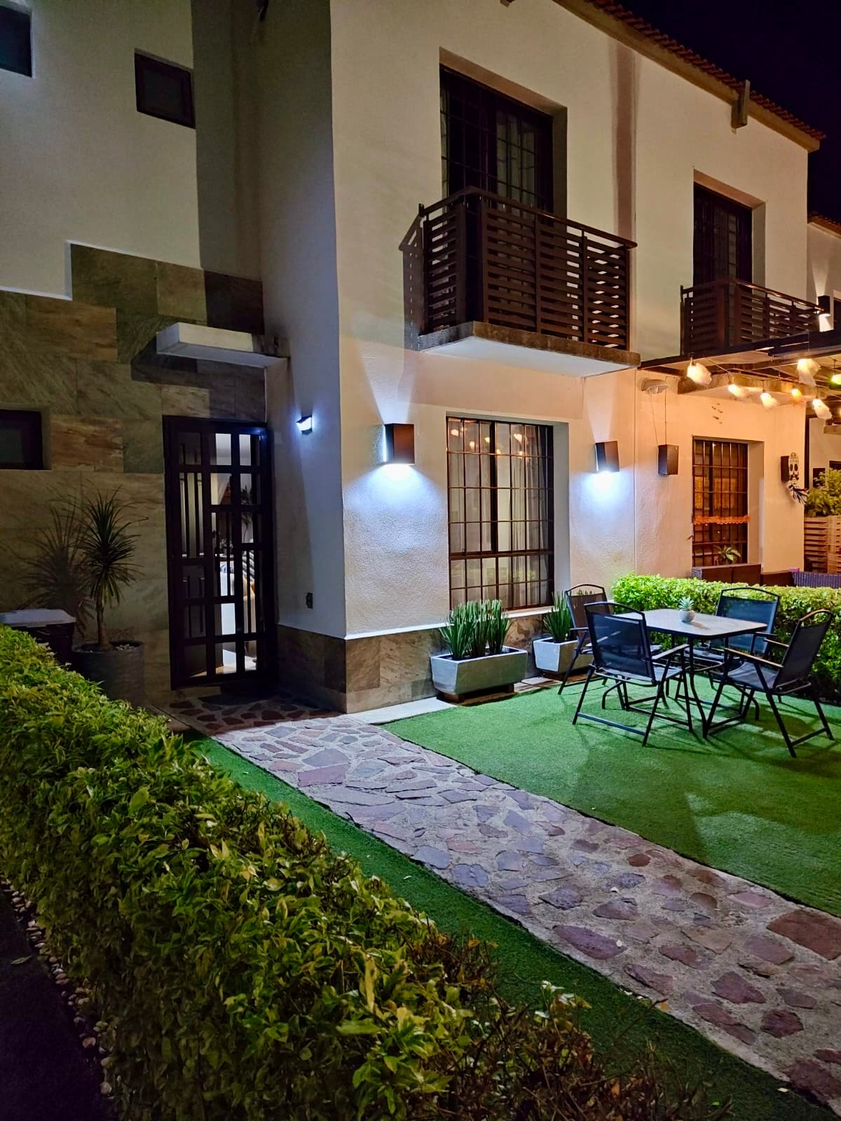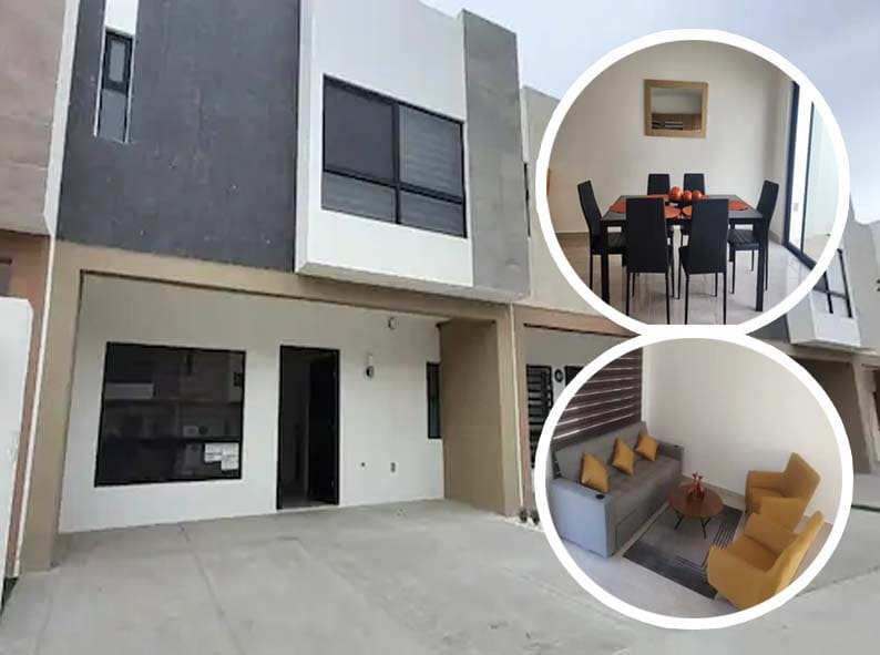 Casa de 2 plantas con cochera p/ 2 autos, jardín trasero, 3 recamaras, la principal con tv, aire ac., vestidor y baño, cocina equipada, sala / comedor para 8 personas y tv, un espacio ideal para relajarse. Cuenta con WiFi de alta velocidad También cuenta con lavadora, secadora y plancha disponibles para ti. La casa se encuentra dentro de un closter privado con hermosas áreas verdes, a 3 cuadras encuentras tiendas, verdulería, ferretería etc. a 6 min del supermercado.