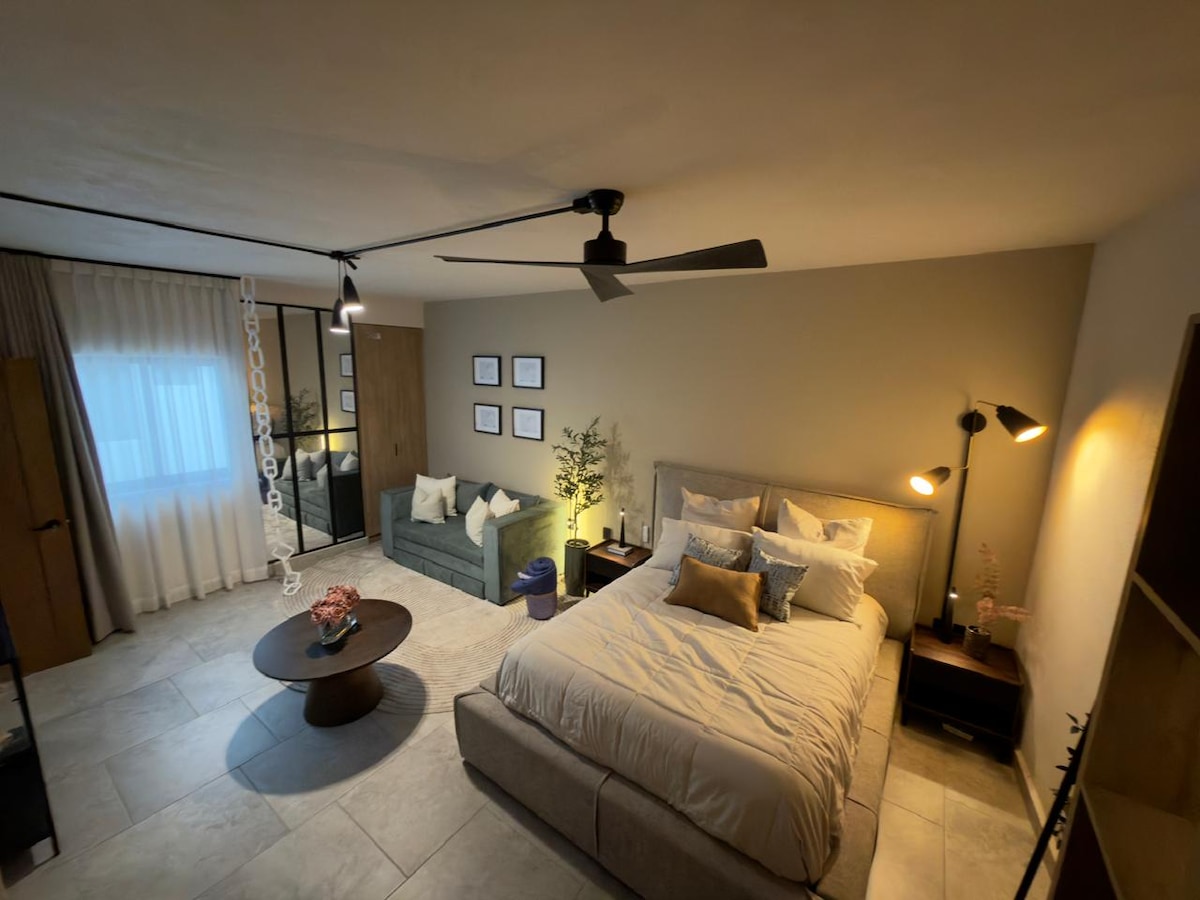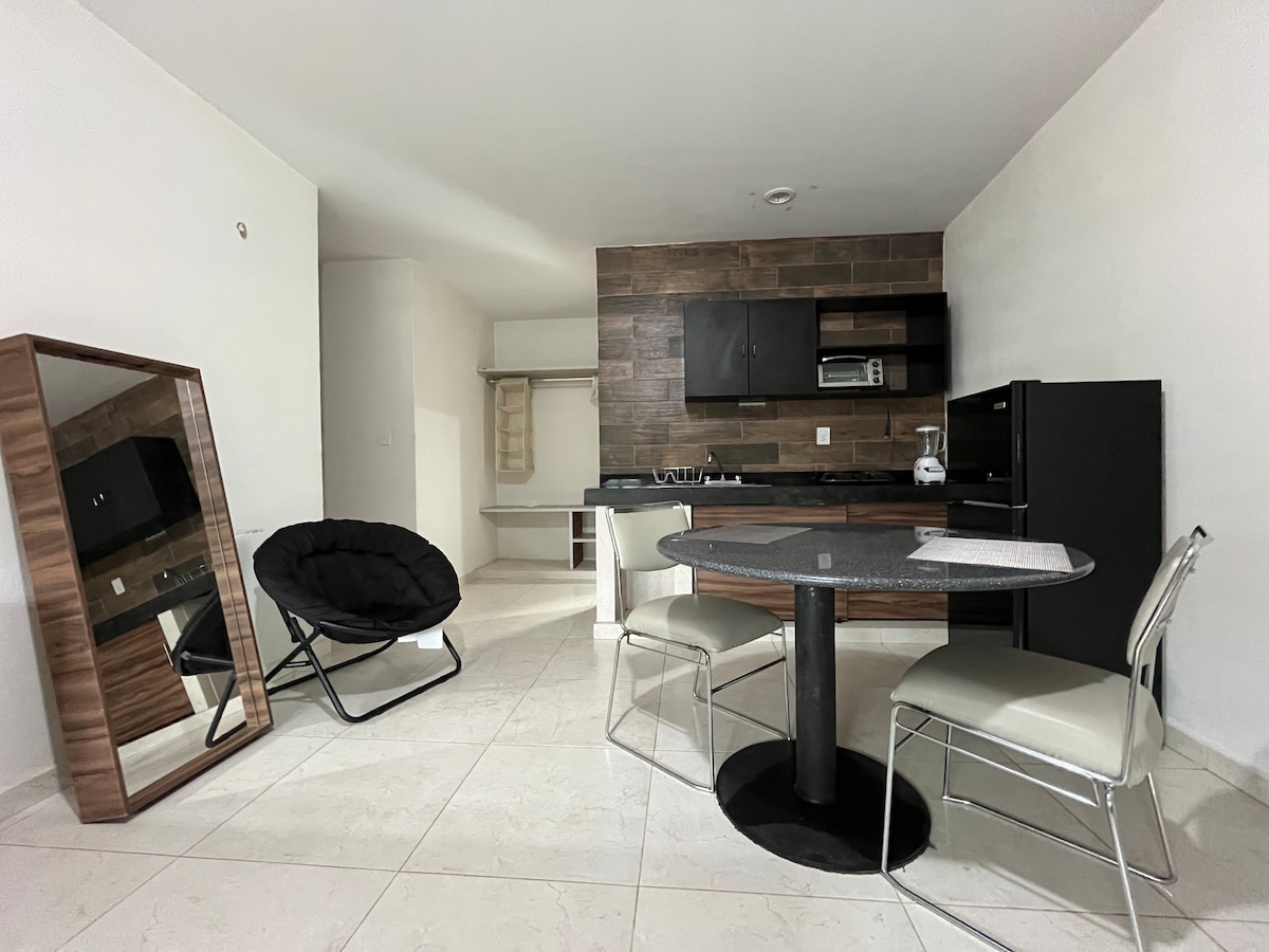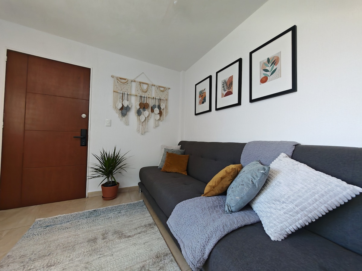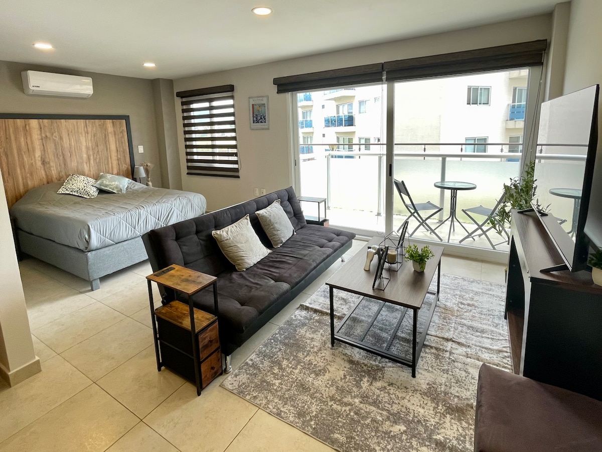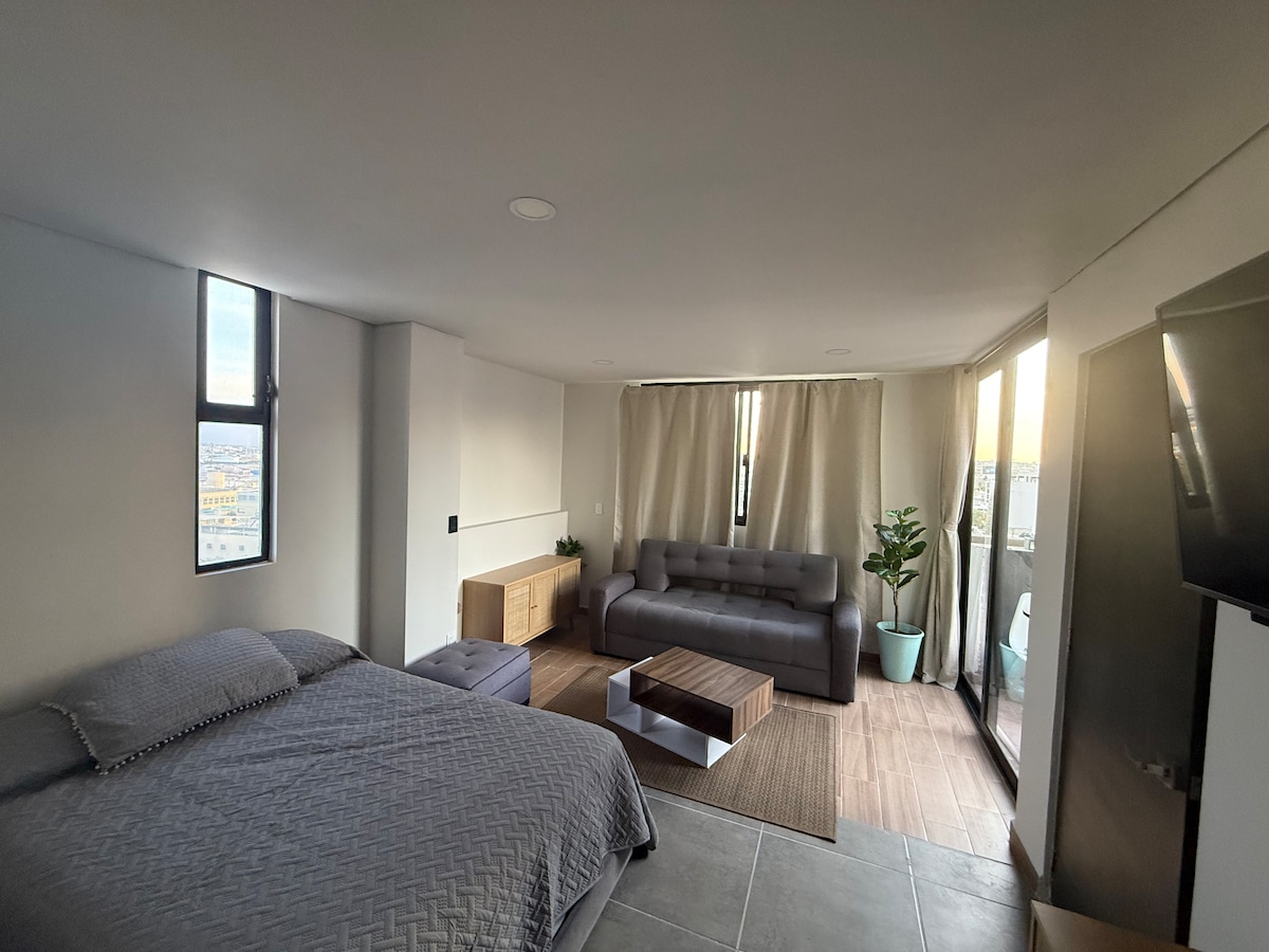 Departamento tipo loft totalmente equipado para gozar de una estadía realmente placentera y como en casa, diseño muy original y acogedor, una amplia terraza para tomar el sol y tener una rica tarde, ubicada cerca de cines, súper,farmacia y tienda de abarrotes frente al departamento, una zona tranquila de la ciudad, el lugar ideal para tener horas de descanso y/o trabajar sin el bullicio de estar en medio de la ciudad.