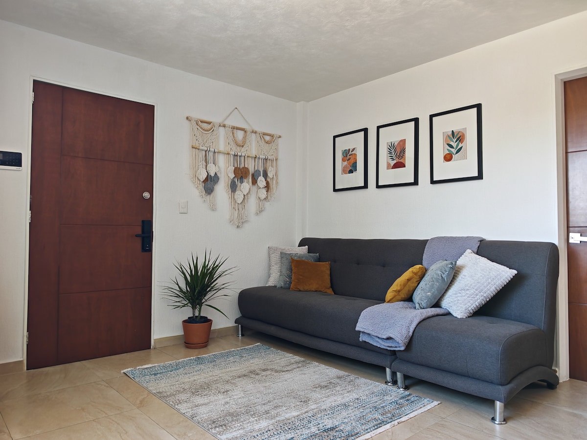 Departamento tipo loft totalmente equipado para gozar de una estadía realmente placentera y como en casa, diseño muy original y acogedor, una amplia terraza para tomar el sol y tener una rica tarde, ubicada cerca de cines, súper,farmacia y tienda de abarrotes frente al departamento, una zona tranquila de la ciudad, el lugar ideal para tener horas de descanso y/o trabajar sin el bullicio de estar en medio de la ciudad.