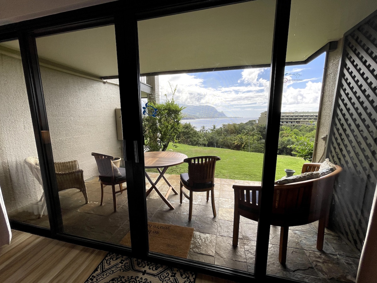 Newly updated 1-bedroom ocean-view condo in Emmalani Court, an exclusive 42-unit complex walking distance to Princeville Resort, Happy Talk Bar, Hideaways Pizza, Princeville's spectacular sunset viewing lookout, and a number of hidden beaches. Our condo sits on the world-famous Makai golf course with ocean views from both the living room and bedroom. Cool trade winds flow throughout the unit and there’s cold A/C in the living room for extra warm days!