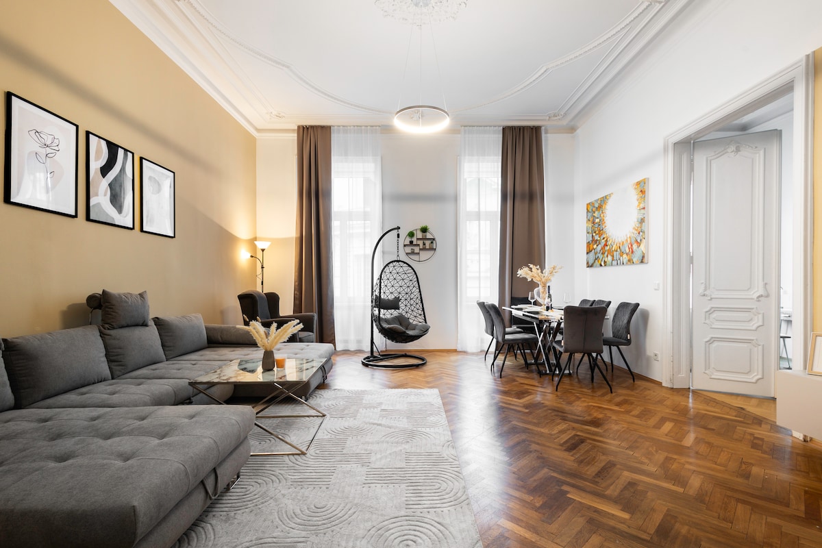 Stay in your own authentic and grand Viennese apartment in the historic Otto Wagner Wundsam Palace right between parliament and townhall. 206 m² for up to 10 guests. Enjoy the two independently workable wings connected by a private entrance hall. Ideal for families, friends or colleagues traveling together. Original etched glass, generous rooms, easy self check-in and breakfast delivery complete the experience. Hotel-grade linens, plush bathrobes, and a fresh breakfast bag to your door.