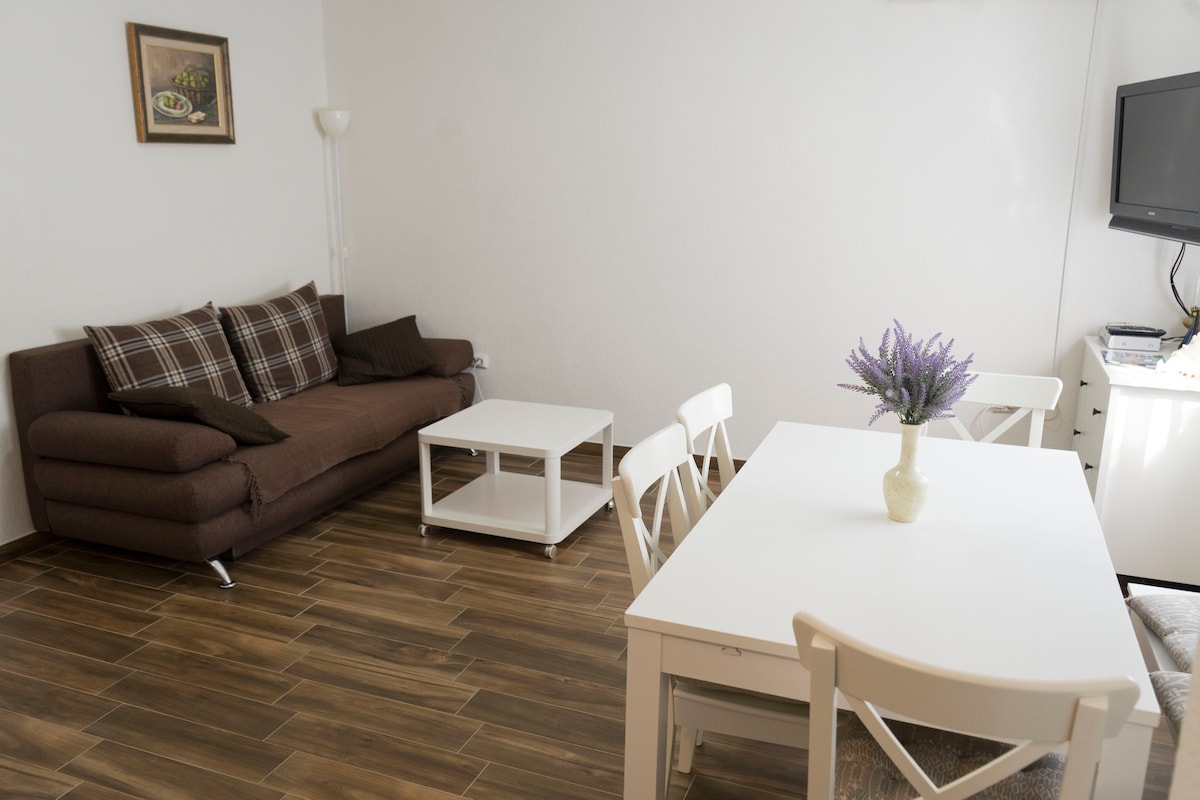 FAST WIFI 7 Connection! The very small room is located on the top floor & offers top views over the bay of Trogir. You can see some islands from the balcony and even Split in the distance. The room is best suitable for 1P. It includes: Kitchenette, AC, small Bathroom (very narrow around toilette, sink & shower), a 43inch Smart TV with Netflix & decent sized balcony. You can see directly out to the sea, while laying on the bed. There is also a small table with 2 chairs and 1 tanning chair.