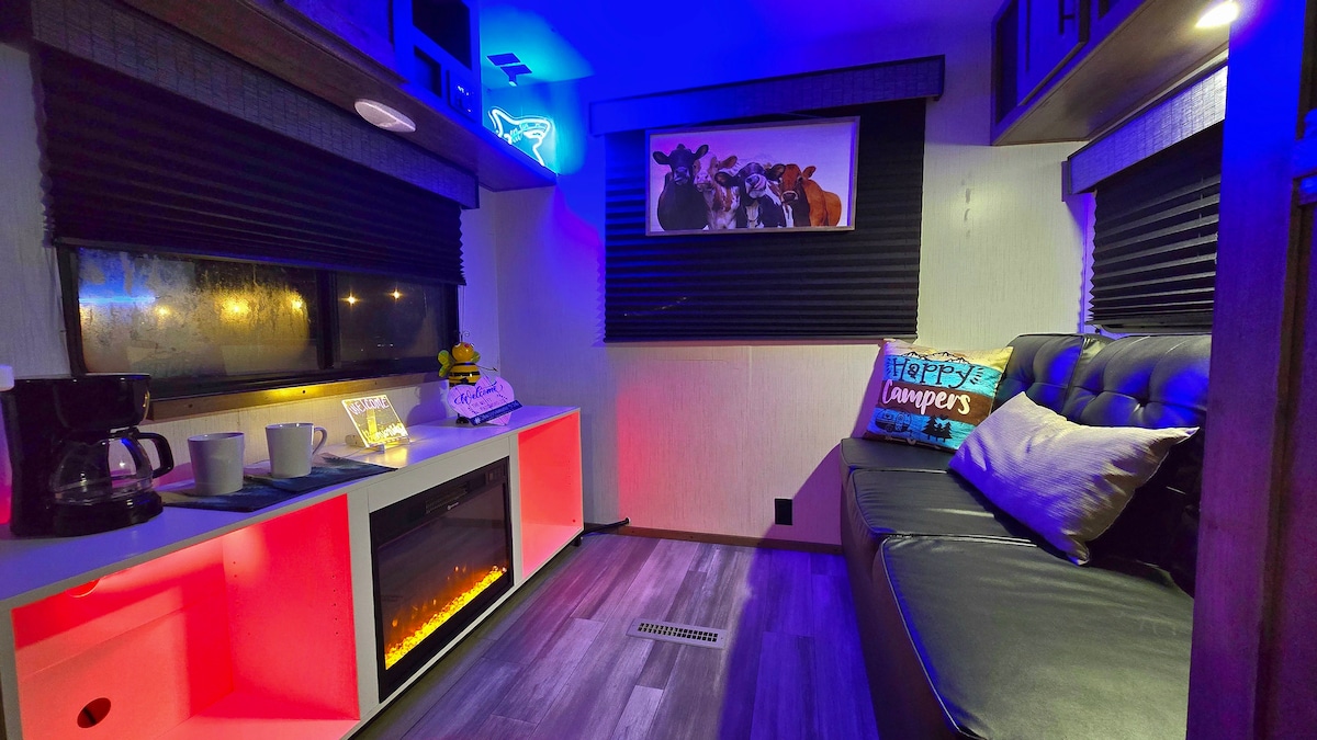 Get away from it all when you stay at the perfect RR glamping spot! Shaded & private lot 138 has everything you need for your outdoor get away! The 5th wheel RV has 4 beds and sleeps up to 7 w/ 1 and 1/2 baths. The toy hauler room can be set as 2 queen bunks, 1 bed and a dining table or dining room. Move your fun outside with your own fireplace, grill, glass fire pit, tons of outdoor seating and golf cart! FIRST RESPONDERS, MILITARY & TEACHERS MESSAGE BEFORE BOOKING FOR A 10% DISCOUNT!!!