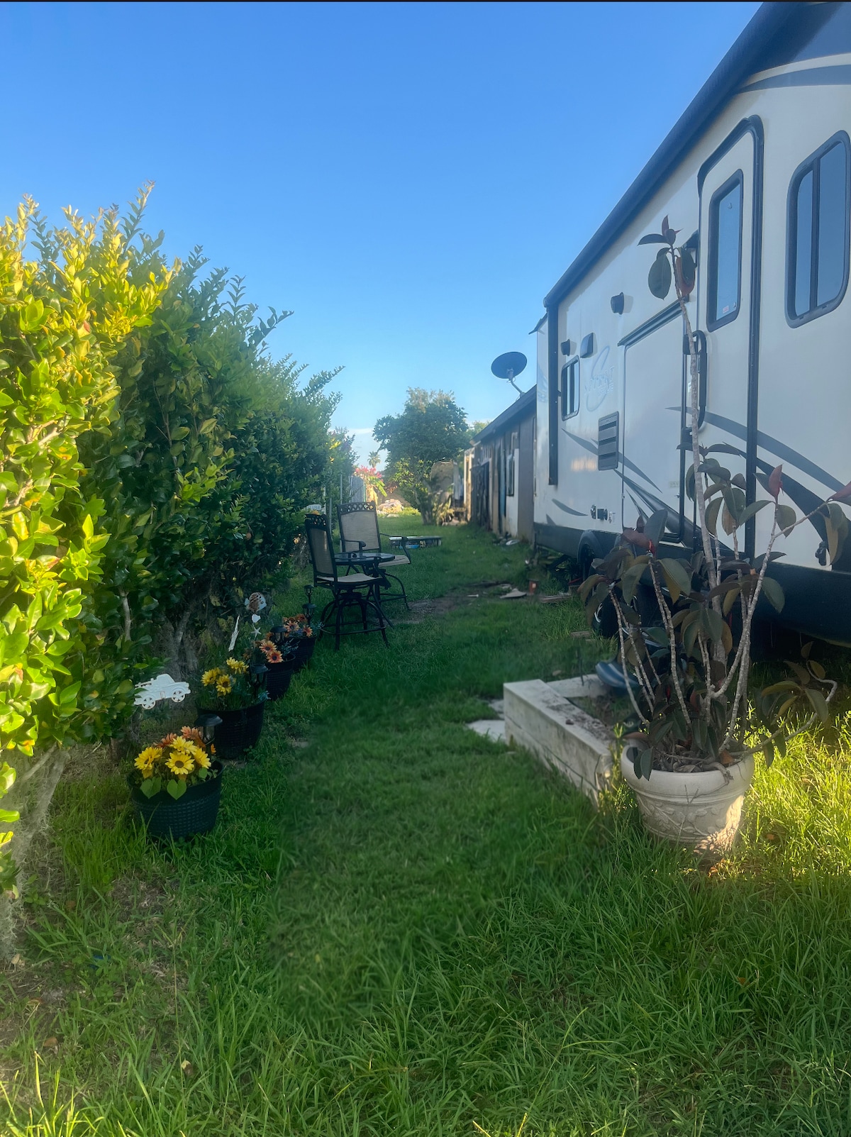 Enjoy this RV camping adventure! It's ready to provide you the perfect getaway for 2! It has 1 queen bed, dinning area, kitchen, bathroom w/shower and a relaxing shared backyard w/ sitting area, perfect to have a nice cup of coffee and listen to birds! 📍25-35 min away from Disney, sunsetwalk, Sea World, Old town Kissimmee, Legoland, Celebration, Bonnet springs park 📍16- 18 min away from Safari wilderness and US Hwy 27 (restaurants and stores)