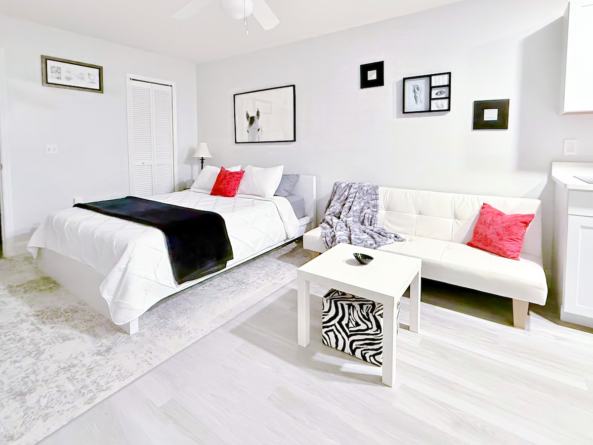 Un espacio sencillo y limpio de 28 metros cuadrados con cubertería completa para comidas ligeras (no hay fregadero exclusivo; se usa el lavamanos y se proporciona detergente y una esponja). Está muy bien ubicado y cuenta con piscina abierta desde el amanecer hasta el atardecer. Hay una zona de fumadores, un amplio jardín y amplio aparcamiento. Traslado gratuito a los parques da Disney en el ❤️ de Kissimmee.
