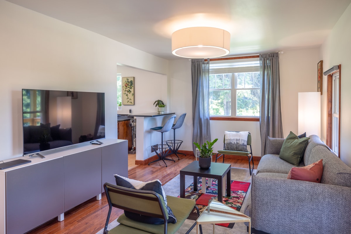 Forget your worries in this spacious and serene space! Our Hideaway is set back off the road in a private setting with restful outdoor spaces to enjoy. Inside the open, spacious main floor is a great gathering place in addition to the downstairs TV/game room. -Level 2 EV -We are only 2 min from Ingles and within 30 min of various popular, local attractions. -We welcome guests of all races, faiths, genders, and sexual orientations. Our goal is for you to have a safe and memorable visit.
