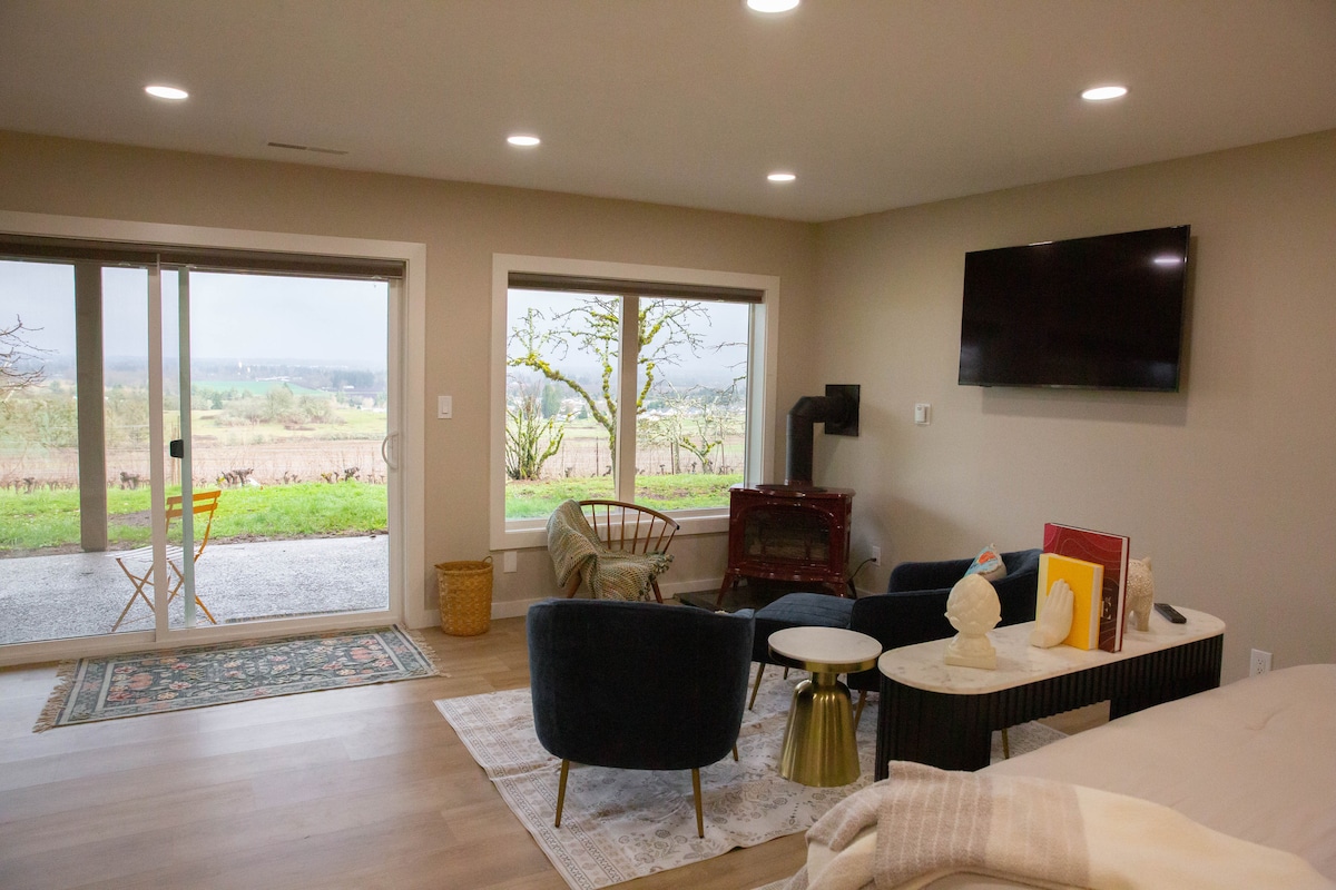 Stay on a beautiful vineyard just 4 miles from downtown Salem. This spacious, beautifully updated studio-style apartment offers gorgeous views, a separate kitchen, and a spacious living/sleeping area. Enjoy your own large private patio—perfect for relaxing with a glass of wine. This is a working winery, so you may see friendly dogs on the property and occasional events. We invite you to enjoy our home, vineyard, and a true taste of Oregon wine country.