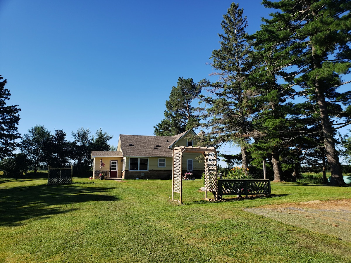 Escape to the country! Discover "Pines" that Whisper located in rural Balsam Lake WI. Our cozy cottage is only a stones throw away from beautiful Half Moon Lake with public access to a boat launch, fishing pier and swimming beach. Enjoy fishing, kayaking, biking and leisurely walks on country roads. Connect with nature and wide open spaces. We are nestled in a private setting surrounded by farm fields. Envision wildlife passing by, loons calling in the distance, & breathtaking sunsets!