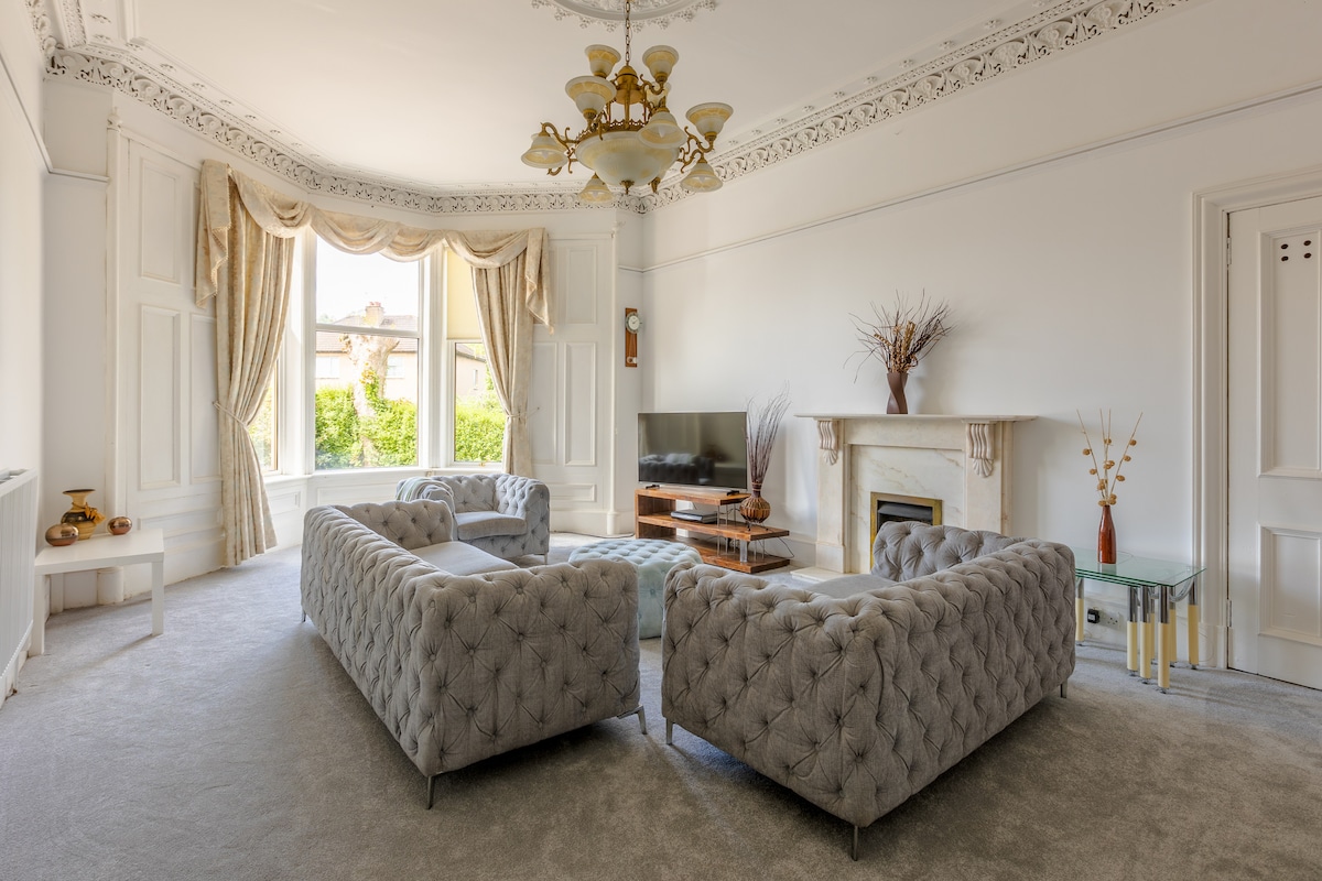 Welcome to stylish, luxury living in this large 2 bed/2 bath light filled garden level apartment. The property has a private front door entrance in a listed town house and is situated in quiet, leafy Park Circus adjacent to Kelvingrove Park. Cosy up with a good book or movie in front of the roaring log burning stove or venture out to enjoy all the local attractions right on your doorstep, including Kelvingrove/Hunterian Museums, Glasgow University, the SECC/Hydro and City Centre shopping.