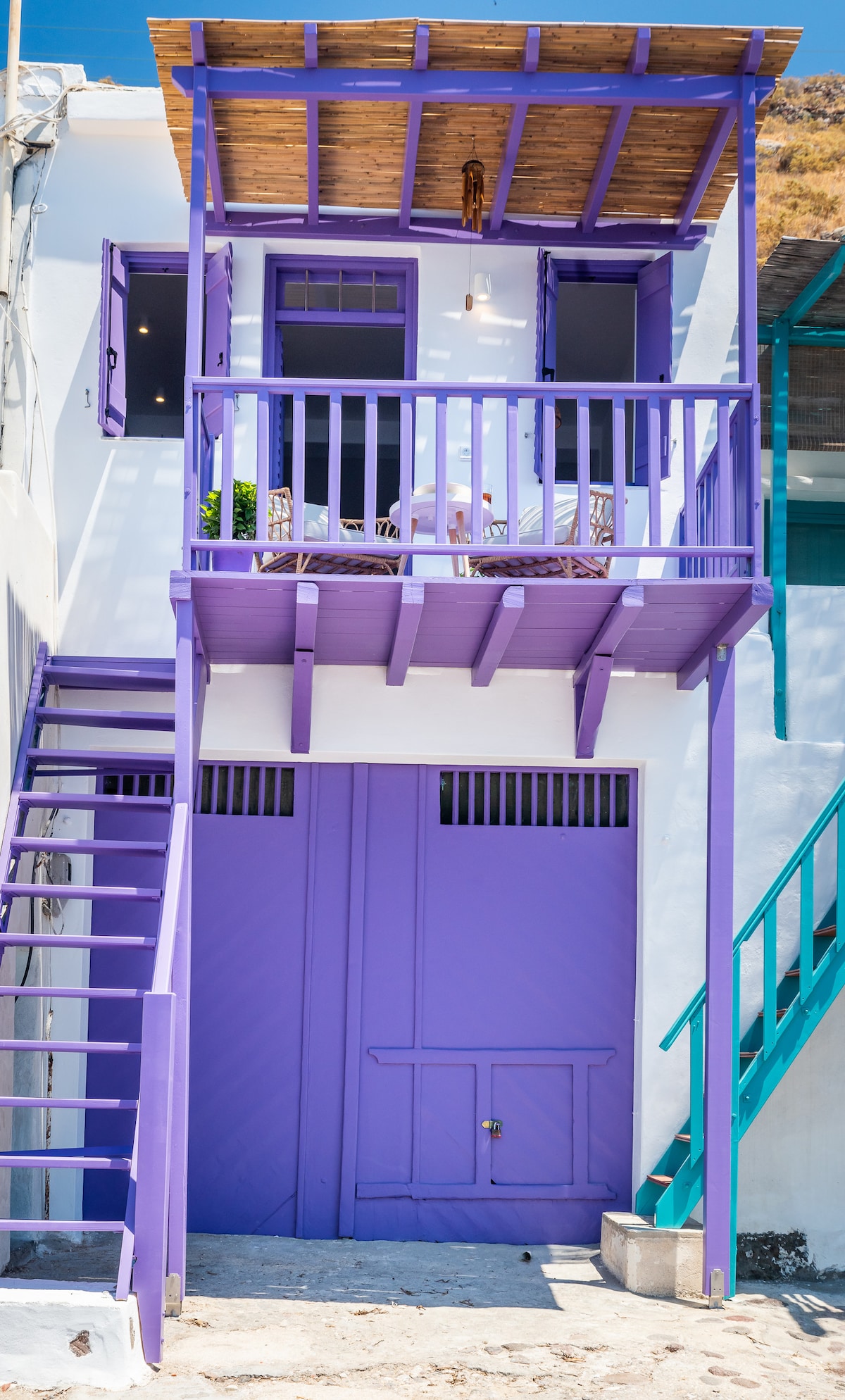 Anemosyrma is a traditional beach house in the magnificent island of Milos. Located in the small picturesque village of Agios Konstantinos, Anemosyrma (“anemos” greek word for wind & “syrma” for Melian boat house) is actually the upper floor of a traditional “syrma”, where people used to drag and store their boats to be protected from the sea. The apartment of 50m2 in an open space plan, has a balcony overlooking the sea and it preserves a modern country style featuring unique Cycladic elements.