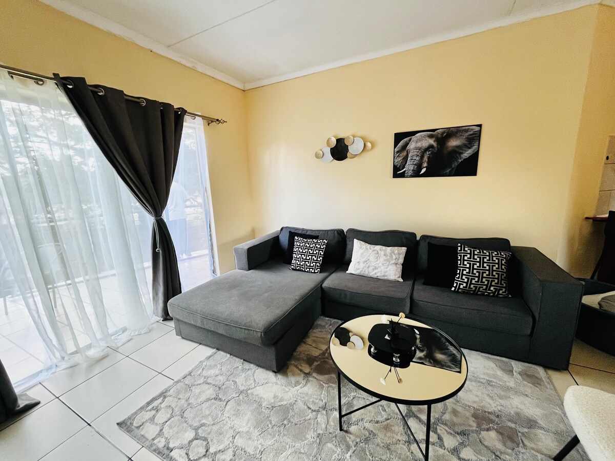 2 Bedroom Flat, (two single beds in each room), living room and kitchen. Private entrance and private garden. Bathroom with shower and bath. Towels and spare blankets provided. Kitchen is equipped with self-catering utensils, stove, fridge with freezer, washing machine, microwave and coffee station. TV with Netflix and free Wi-Fi available. Access to communal pool and braai area. Gated parking with security cameras. Located near mall, hospitals, schools, stadium and nature reserve.