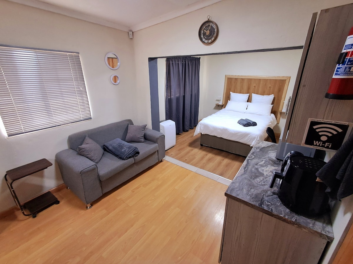 Centrally located, close to major shopping centers (Woolworths, Checkers, Virgin Active), schools and hospital. The property offers secure parking and free wifi. The unit is equipped with private bathroom and kitchenette. Recently renovated featuring a garden. This unit includes bed linnen and towels. Fitted with aircon, air fryer, Android tv and Netflix.