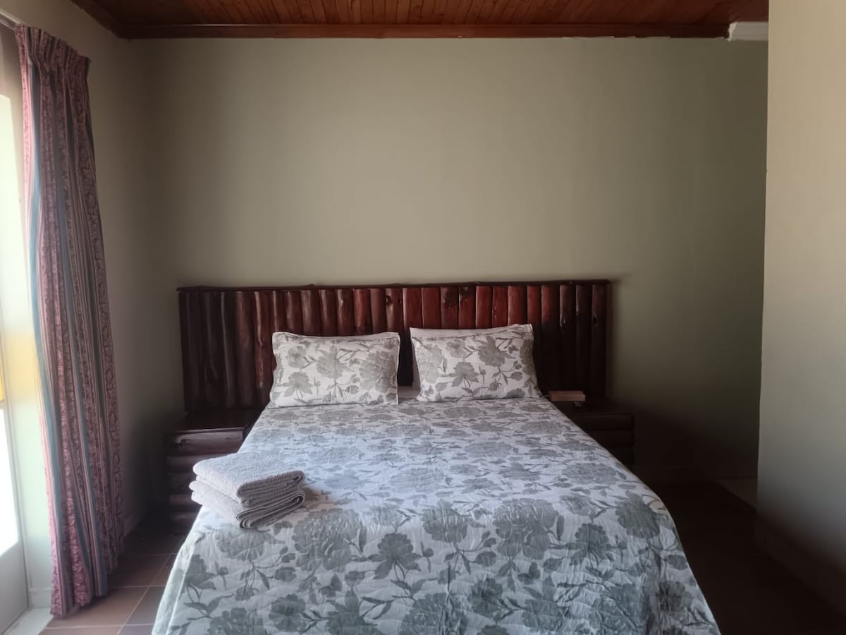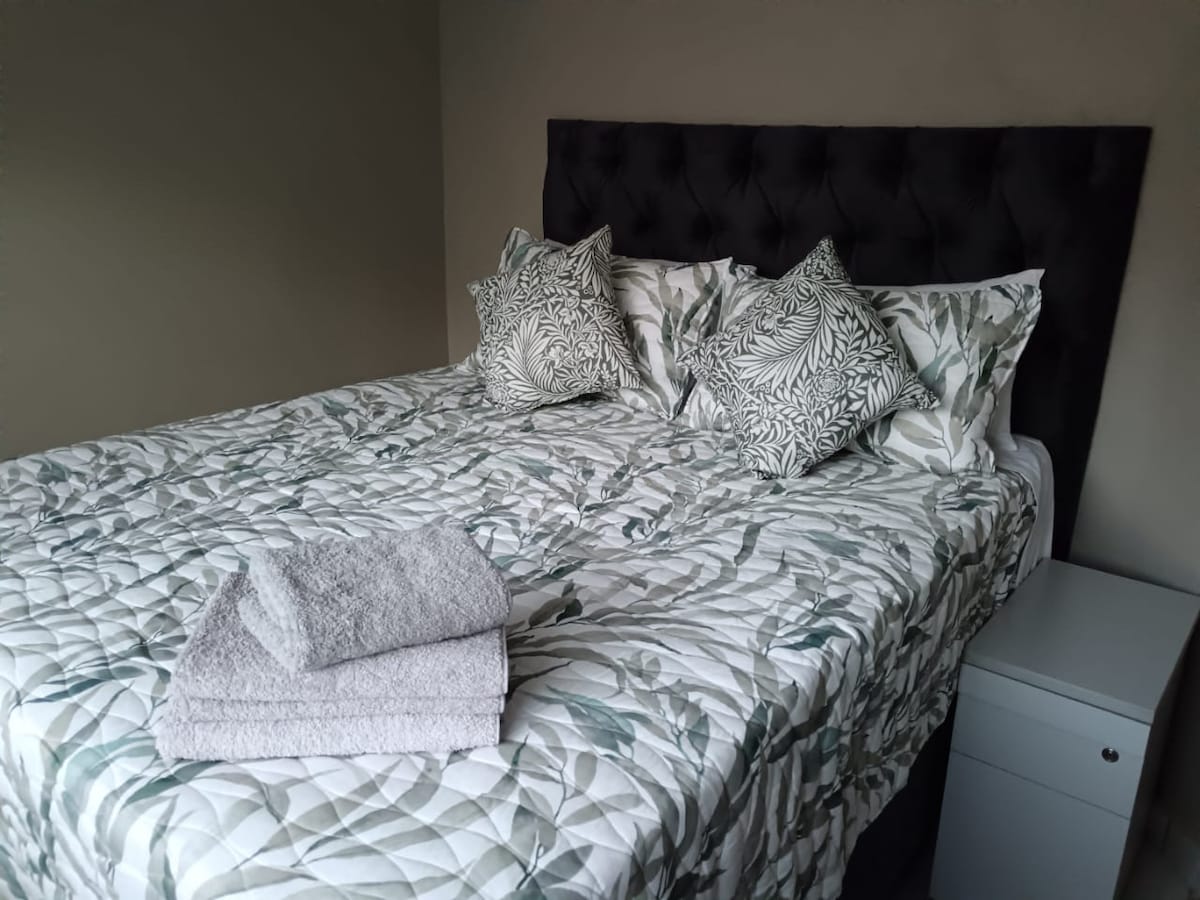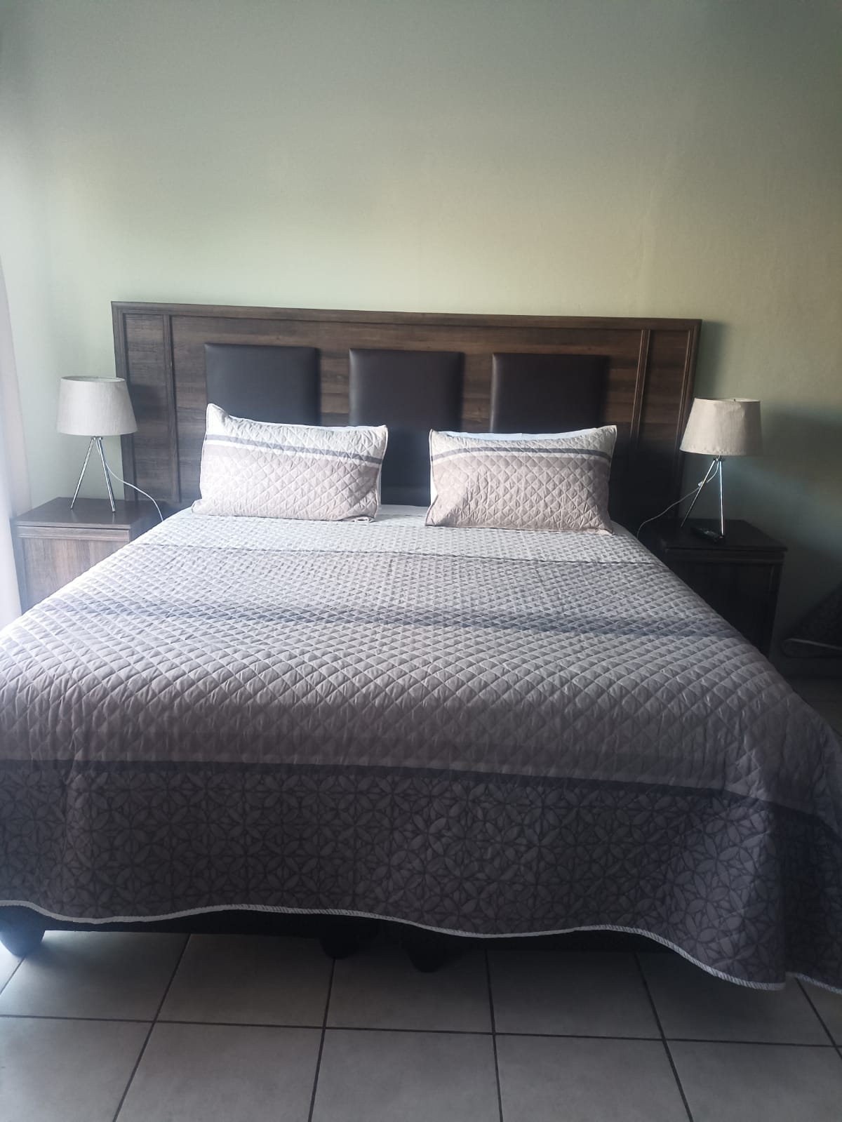 1 Bedroom Flat, (queen size bed), two single beds in living room and kitchen. Private entrance and private garden. Bathroom with shower and bath. Towels and spare blankets provided. Kitchen is equipped with self-catering utensils, stove, fridge with freezer, washing machine, microwave and coffee station. TV with Netflix and free Wi-Fi available. Access to communal pool and braai area. Gated parking with security cameras. Located near mall, hospitals, schools, stadium and nature reserve.
