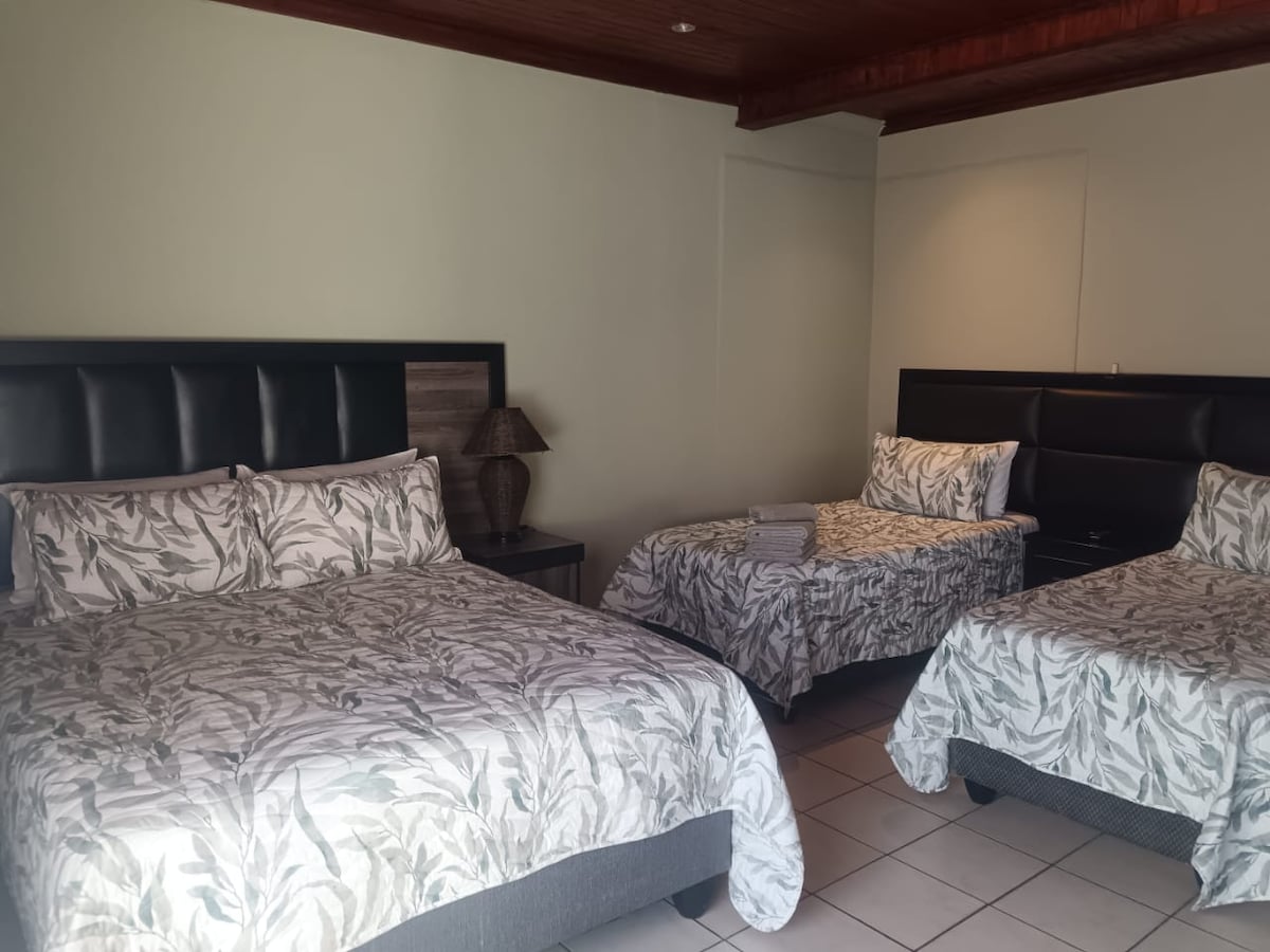 Blue Haven guesthouse is a Haven away from home. We understand that when traveling, you need a secure and safe space to put your head down for the night. And that is what we love providing. Good, clean accommodation at a reasonable price. This room has three single beds, en- suite bathroom with shower and toilet, kitchenette for heat and eat with microwave, fridge, utensils, and sink bowl. Also has a flat screen TV.