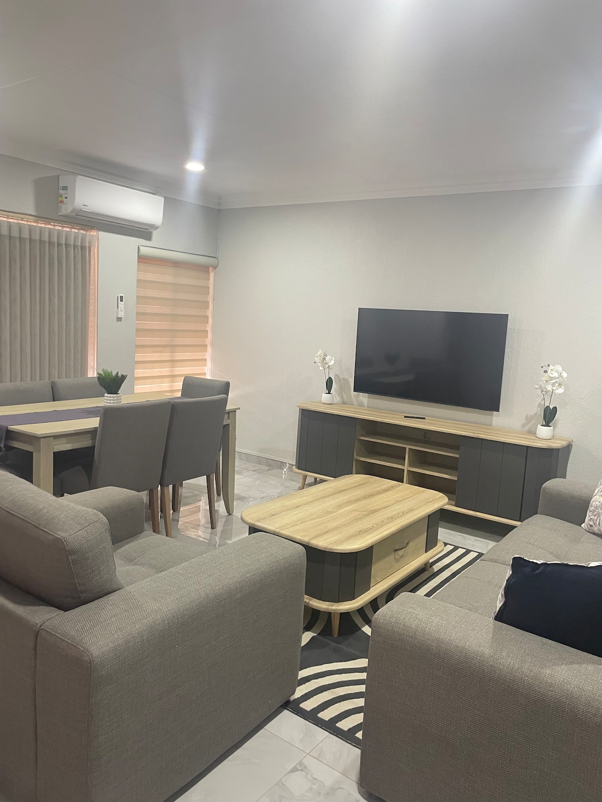Unit 1: It’s a one bedroom, en-suite a fridge, microwave, kettle, utensils, smart tv, working space, and unlimited WiFi. Unit 2 &3 Is a self catering unit with a spacious bedroom with a full bathroom,dining area, spacious sitting room with couches,fridge,microwave, kettle,Utensils ,smart tv,working space, WiFi ,stove,pots. Unit 3: Similar to unit 2 with 2 bedrooms with a separate bathroom. Free parking,Outdoor sits, braai, leisure & business trips, Savannah mall,Private hospitals,Uber eats