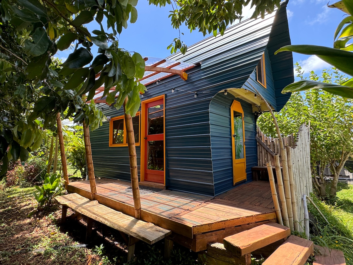 Enjoy this uniquely custom built art piece, set in garden surroundings, abundant fruit trees, rustling of leaves, and warm shapes and colors to embrace you, as you look out at peekaboo views of the ocean. This space includes ample solar for electricity with dimmable lighting, and a beautiful cypress composting toilet with handheld bidet, and rheostat fan, leaving only refreshing smells of wood shavings. Come enjoy this curvy, fairy tale hideaway, within walkable distance to charming Hāwī!