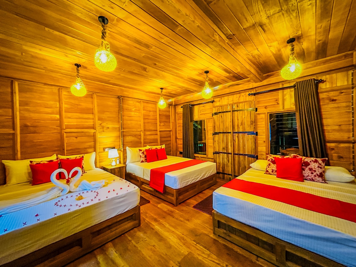 The Rock & Paddy Resort Nestled amidst the lush greenery of a vibrant garden in Sigiriya, our treehouse offers an unparalleled escape. Crafted from beautiful, natural wood, it harmonizes perfectly with its surroundings, providing a truly authentic experience. Just steps away, a serene lake shimmers, adding to the tranquility and picturesque views. Inside, you'll find a haven of comfort and relaxation, thoughtfully designed to accommodate up to four guests with ease