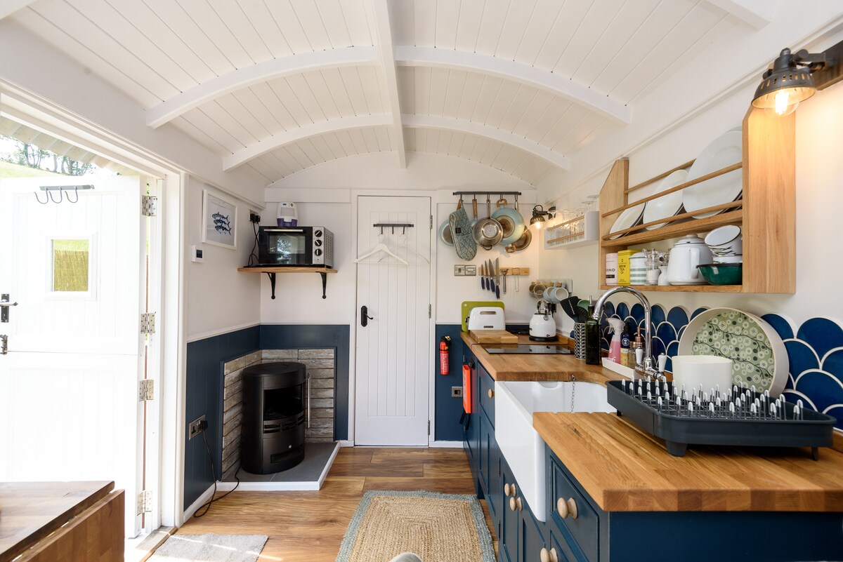 Penlea Retreat is our romantic shepherds hut. It is set in its own large private enclosed garden overlooking National Trust farm land in one of Cornwalls most beautiful fishing villages. - Amazing geodesic relaxing and dining dome with cosy woodburning stove- be 'outside' whatever the weather! - 5 minute walk to the beach and pubs (10 uphill minutes back) -Wood fired hot tub- relax under the stars -Ensuite shower room with flushing toilet - Ooni pizza oven hire ( £20)