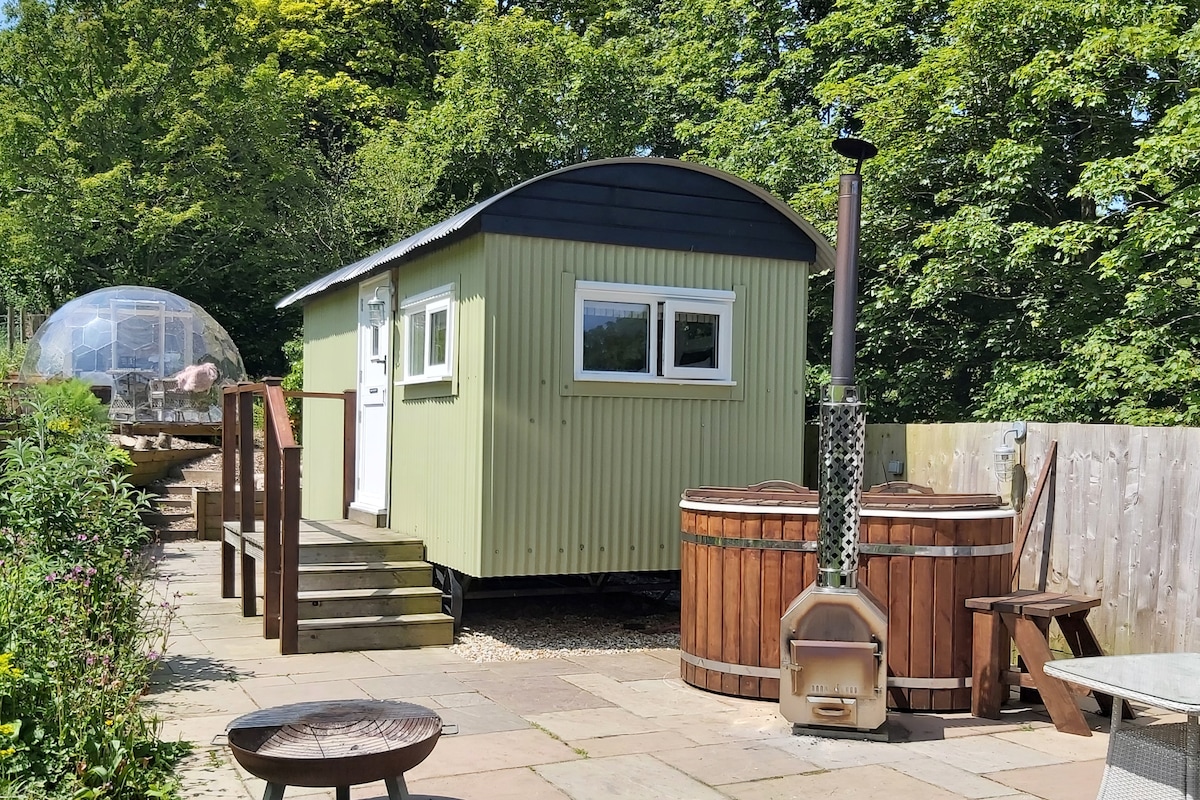 Penlea Retreat is our romantic shepherds hut. It is set in its own large private enclosed garden overlooking National Trust farm land in one of Cornwalls most beautiful fishing villages. - Amazing geodesic relaxing and dining dome with cosy woodburning stove- be 'outside' whatever the weather! - 5 minute walk to the beach and pubs (10 uphill minutes back) -Wood fired hot tub- relax under the stars -Ensuite shower room with flushing toilet - Ooni pizza oven hire ( £20)