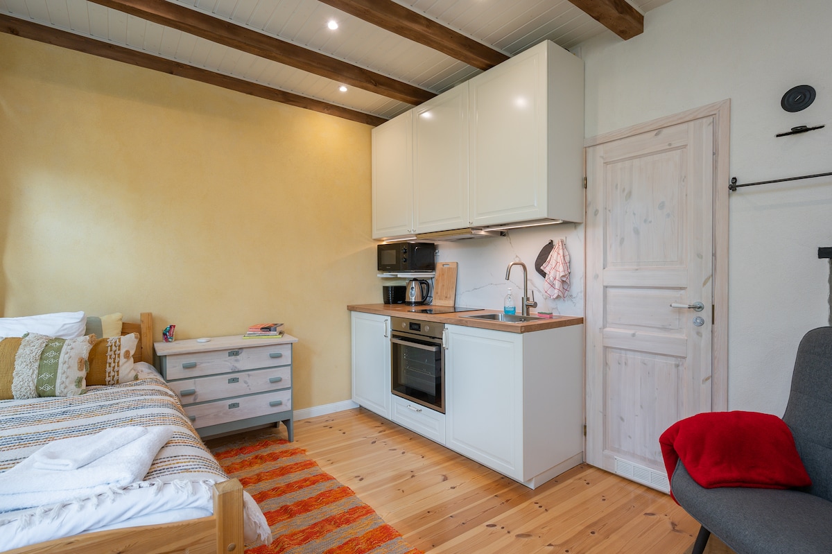 Feel the true Tartu spirit in this historical and sustainable hidden gem in the centre, a quiet and superprivate 19.century wooden backyard house with a private terrace into a lush garden. Ecologically renovated studio has a fully equipped kitchenette with basic foodstuff, stove for extra winter hygge, double bed, free wi-fi and much more. Allergy free cleaning agents and laundry detergent. Environmentally conscious guests are especially welcome.