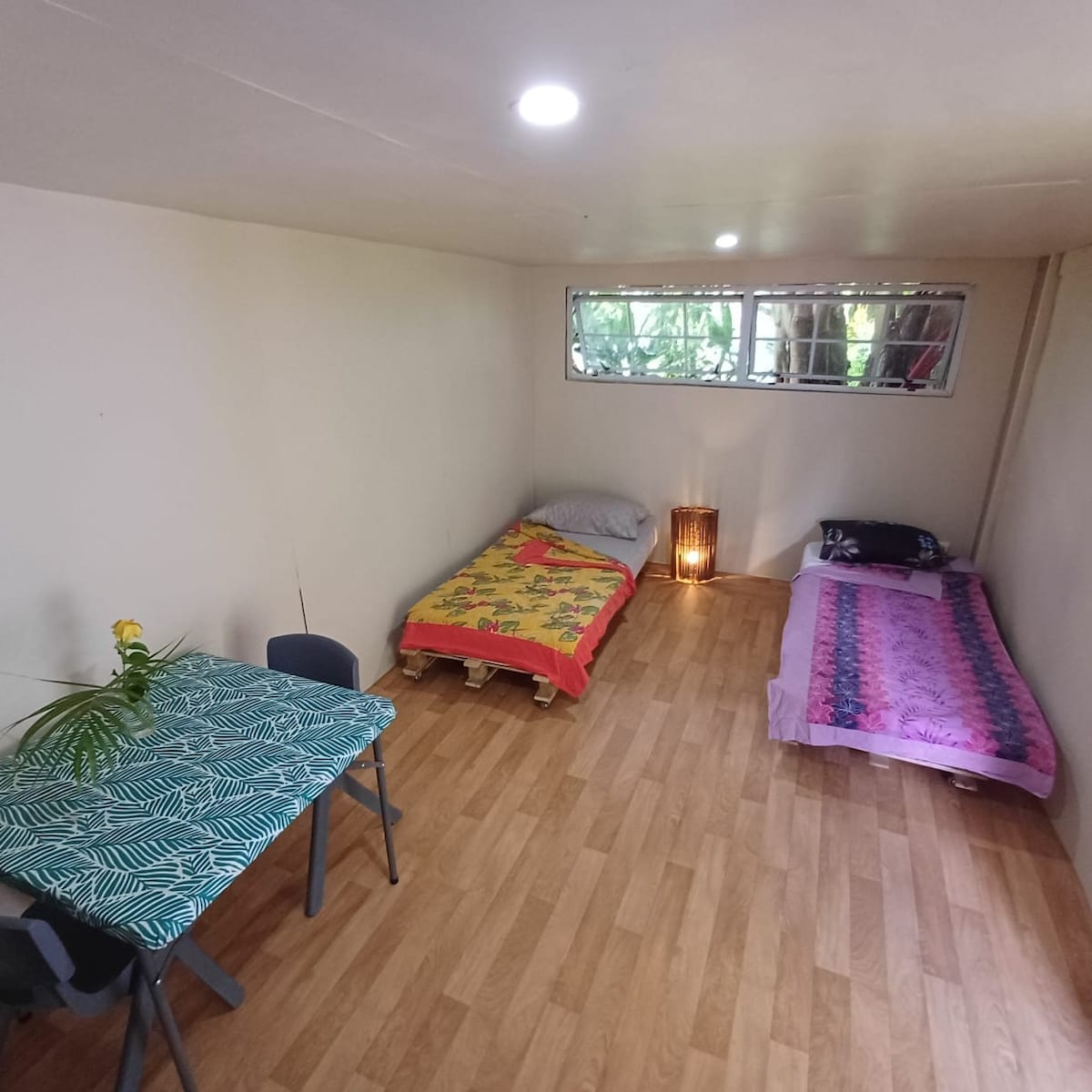 Bienvenue à Rangiroa! Simplifiez-vous la vie dans notre auberge de jeunesse paisible et central. Les espaces communs : 1 salle de bain avec toilette, 1 cuisine, 1 salon, 1 salle à manger extérieure . À proximité : - 5 min à pied de l'aéroport de Rangiroa, pas besoin de payer le taxi - Centre commercial Vaimariu à 5min - Restaurant Rio Envie de dépenser moins et profitez plus? C'est chez les AMI'S !