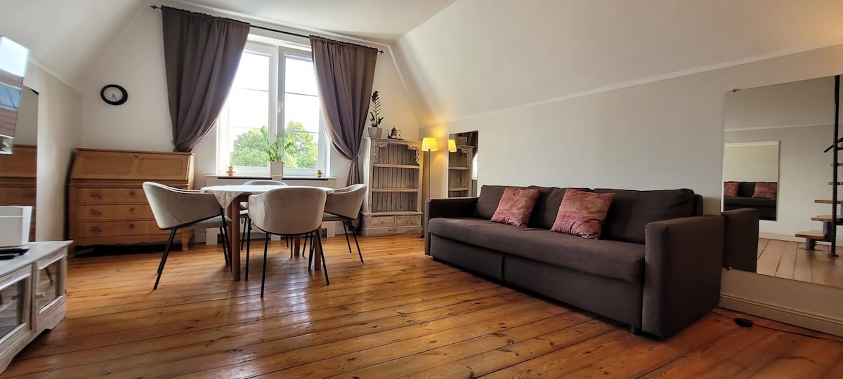 TWO-FLOOR APARTMENT IN THE HEART OF GDANSK OLD TOWN. - picturesque historic building in a quiet yet very central location - 4th floor (no lift) with attic - scenic view over the Old Town roofs & St Mary's Church - famous Długa Street and Motława river bank around the corner, with cafes, restaurants, clubs, stores and other services - 5 min walk from Gdańsk Main Railway Station, 3 min away from city tramways, bus stops and taxi ranks - 24h self check-in