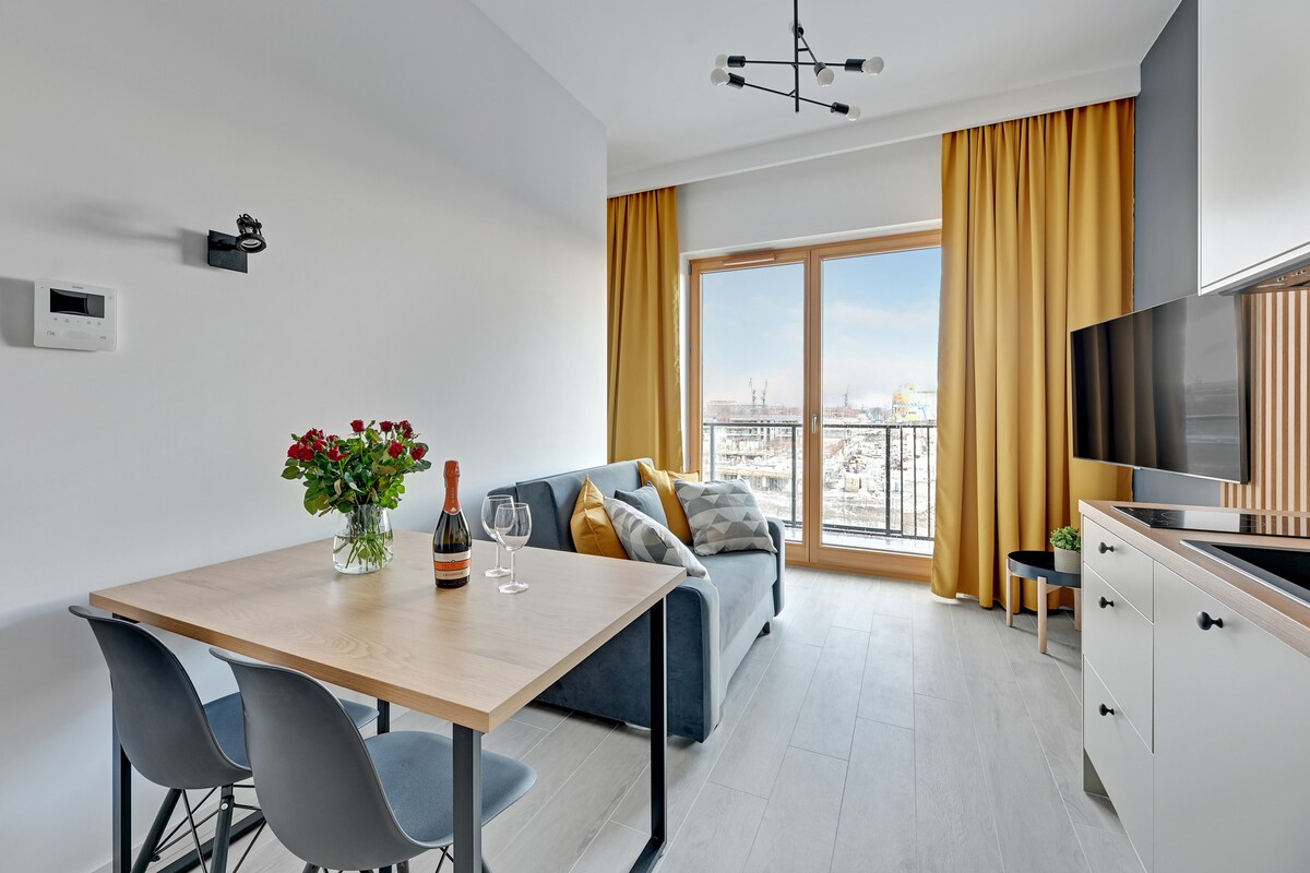 Wyjątkowy apartament z niepowtarzalnym widokiem na Stare Miasto w Gdańsku, który można podziwiać z przestronnego, umeblowanego tarasu. Apartament znajduje się w bliskim sąsiedztwie rzeki Motława. Przestrzeń w pełni spełni oczekiwania wymagających klientów, na wyposażeniu apartamentu znajdują się: klimatyzacja, ekspres do kawy oraz smart TV. Dodatkowo do dyspozycji gości jest siłownia dostępna w kompleksie (bezpłatnie).