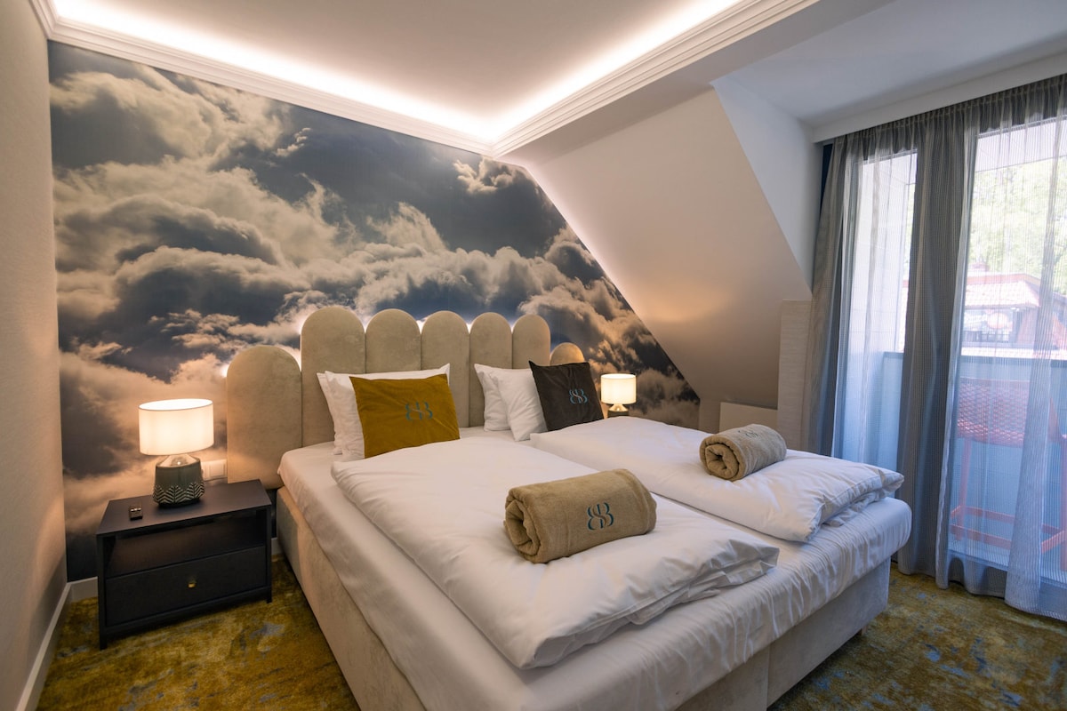 Twin Room with two separate beds. Amenities in the facility: - Air-conditioned rooms and breakfast zone - WiFi - Elevator - The rooms are equipped with electronic locks - Taking care of the guest during their stay - Iron and ironing board - Free access to coffee, tea and homemade cake in the afternoons Additional services: Breakfast - 55 PLN/day/person Parking - PLN 50/day (earlier reservation required)