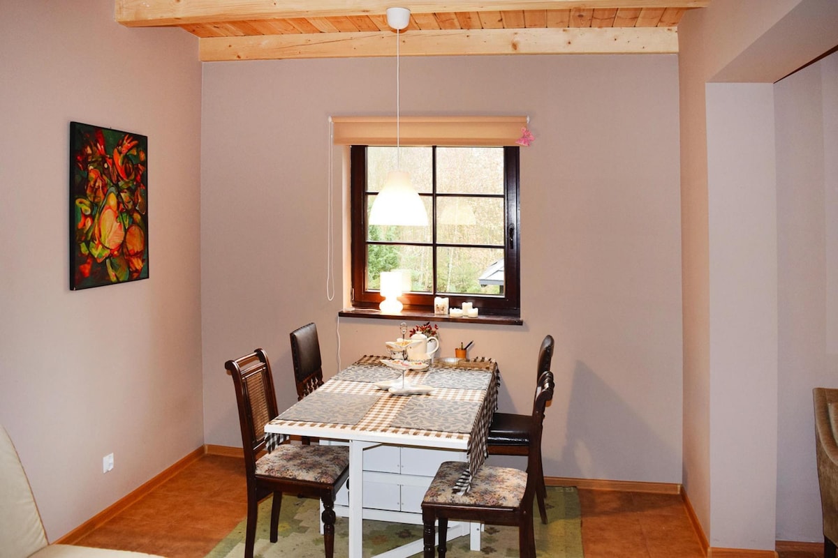 Eko Domek w Junoszynie jest położony w otulinie Parku Krajobrazowego Mierzeja Wiślana, zaledwie 1500 metrów od szerokiej, naturalnej plaży, do której prowadzi szeroki, leśny dukt. Blisko stąd do popularnych kurortów (Stegna, Jantar), ale Junoszyno to wciąż nieodkryta oaza spokoju i sielskiej atmosfery. Oferujemy 2 samodzielne apartamenty idealne dla grupy znajomych lub dwóch rodzin (łącznie do 12 osób) o powierzchni 55 m2 każdy, prywatny taras o powierzchni 23 m2, plac zabaw oraz duży grill.