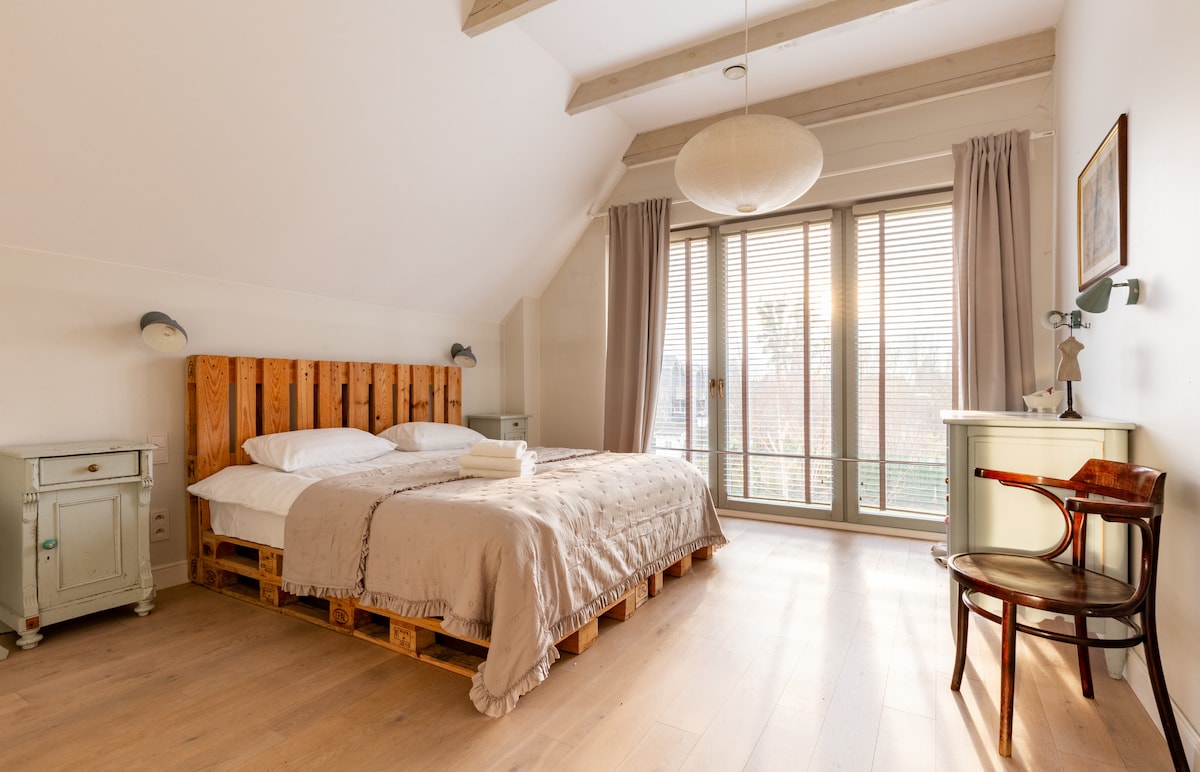 Jest to bardzo nietypowy dom, pownieważ wynajmujecie go na wyłączność wraz z całą posiadłością, której połowę zajmuje całkowicie prywatne jezioro. W posiadłości znajduje się też: prywatny las, ekologiczny ogród i sad, park, kort tenisowy i boisko do siatkówki. Na miejscu macie do dyspozycji rower wodny, łódkę wędkarską, leżaki, sprzęt sportowy. W domu jest miejsce dla 18 dorosłych osób w 8 sypialniach. Są tu też 2 salony oraz taras z kuchnią letnią. Za dodatkową opłatą sauna i balia z jacuzzi.