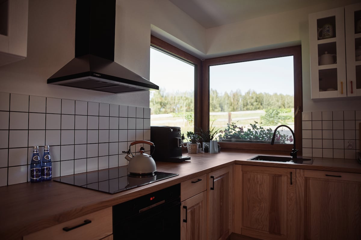 The Bielawy House has been specially designed for relaxation. It features a modern, chlorine-free (active oxygen) heated pool with a massage bench, a 6-person jacuzzi, and a high-quality sauna. The spacious garden includes a playground, ping pong table, monkey bars, trampoline, and volleyball court! Inside the house, guests can relax by the fireplace, play table soccer, Xbox, or poker. The well equipped kitchen provides ideal conditions for cooking. Nearby, there are beautiful lakes and forests