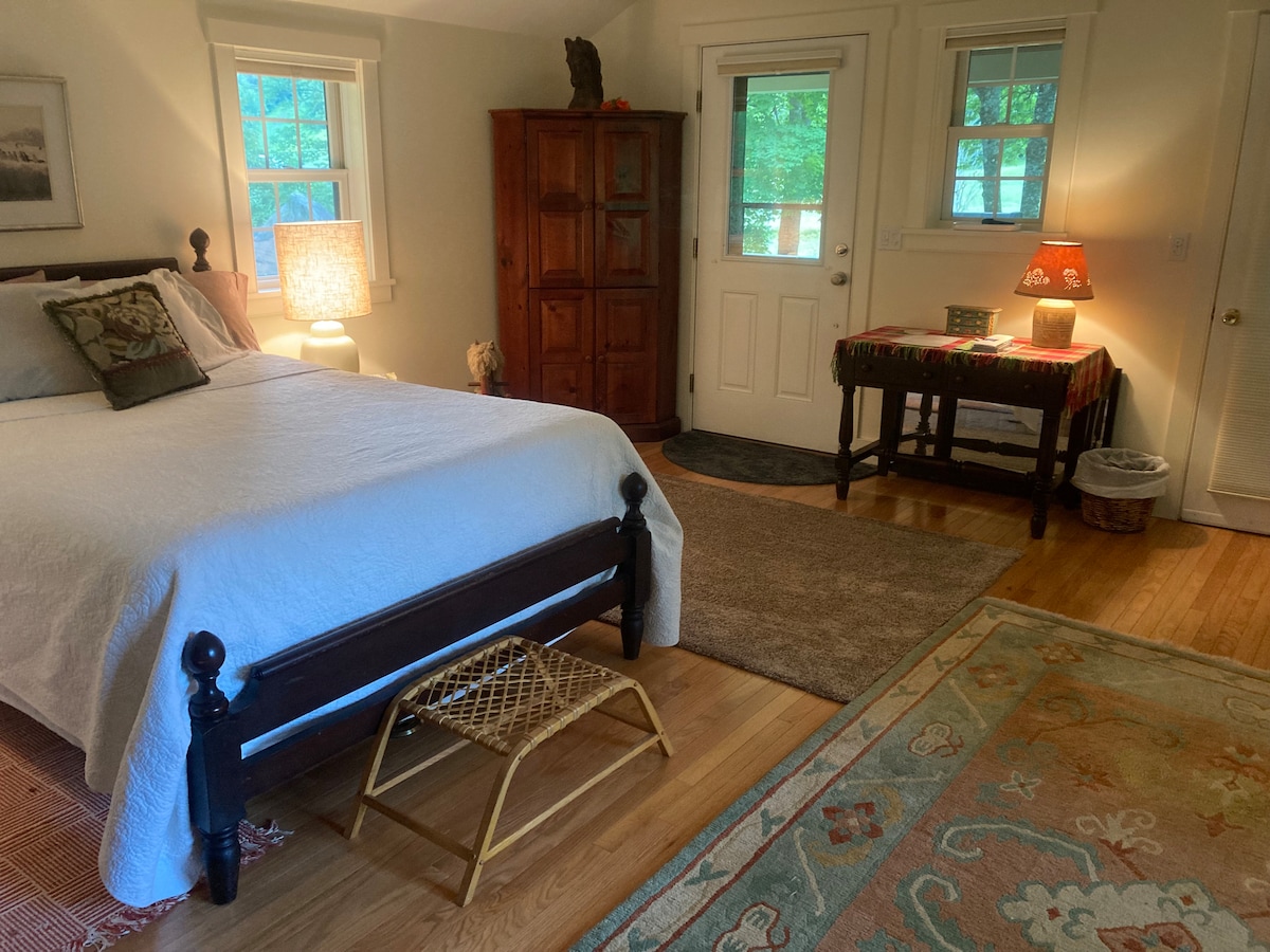 Contactless check-in. Cozy guest house, cabin-studio-getaway; enjoy the sounds of a stream outside the window (next to the bed). Views of a larger brook below. The"Cabin"is nestled in the trees giving a feeling of floating above the brook below. The interior is decorated w/family heirlooms gathered from around the country. Nothing fancy, just a cozy simple getaway. 3.25 mi from town. Choose from a variety of activities in town or hop on nearby trails. NO PETS ALLOWED.