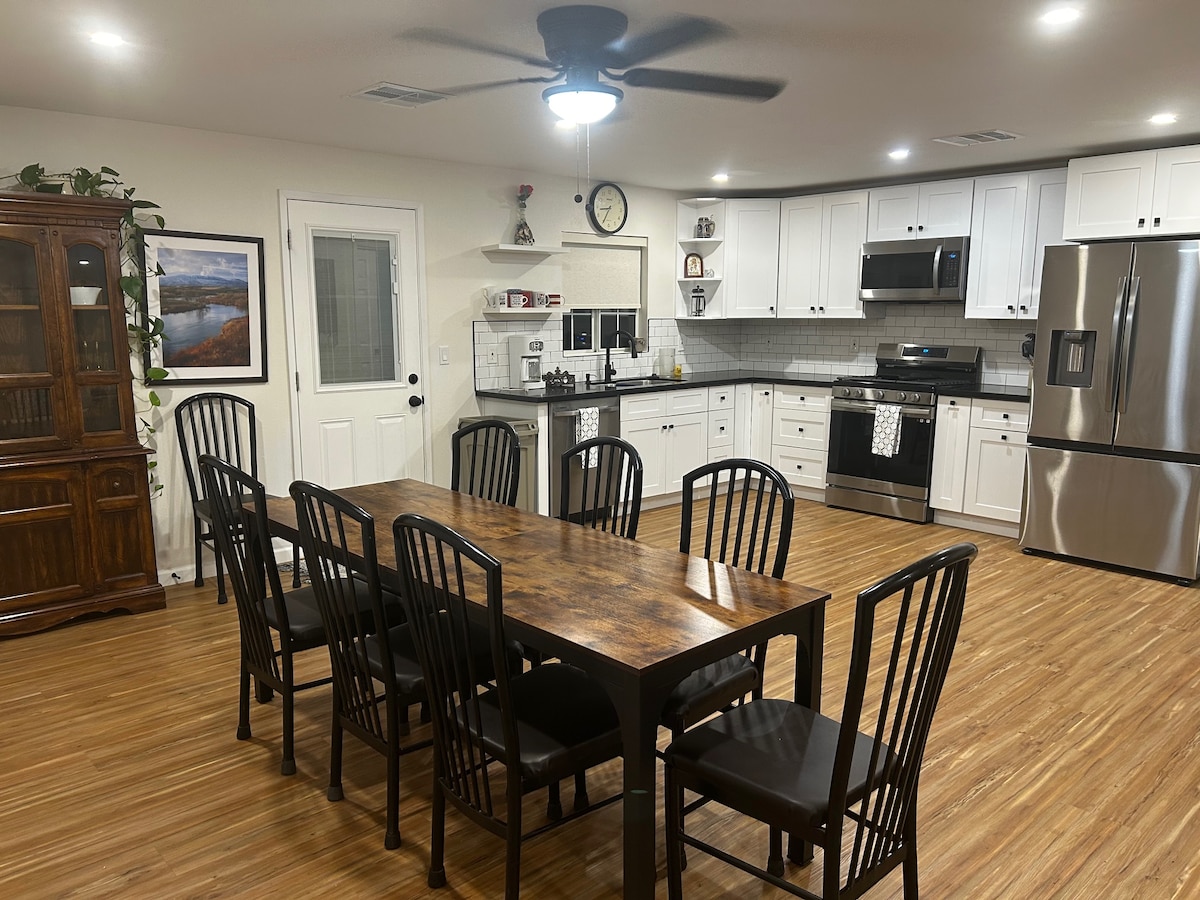 New construction 2 Bed 1 Bath Modern Hidden Gem! This Guesthouse has its own private yard, entrance & driveway. At just under 600sqft, No stone was left un-turned when Designing this space. This open concept Home features a living area with a Sleeper Sofa, 50" Roku TV, 4 chair dining table, A Remote controlled AC & Heat system. Full Kitchen with Microwave, Oven, Fridge & Washer/Dryer. Full Bathroom with Tub & Shower. 2 bedrooms, 1 with a queen bed & the other w 2 twin beds.