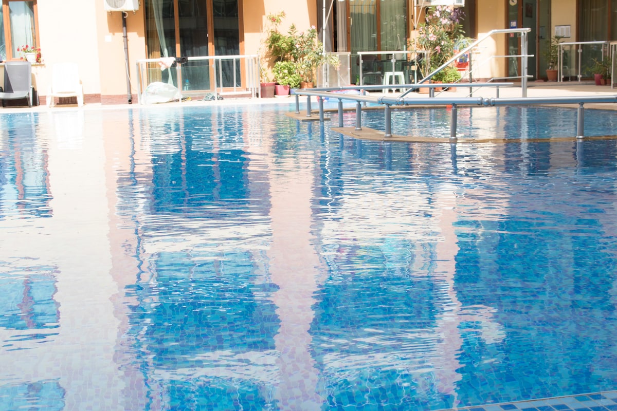 The apartment is situated in the Sunny Beach resort. The beach is only 450m away. Busy district, easy access to main street and the centre with all the communications and places. The popular aquapark is not far. The apartment is fully furnished and equipped, has OWN SEPARATE exit to the swimming pool. The territory is under security. The park zone is nearby, as well as 24/7 supermarket, public transport. To the Nessebar Old town - 10 minutes by bus.
