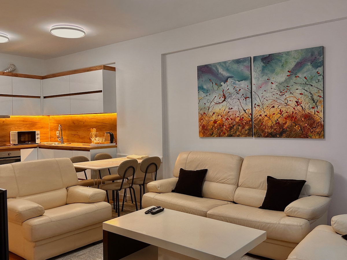 Welcome to our modern apartment in the heart of Prishtina! Located on Ahmet Krasniqi Street, across from the U.S. Embassy and just 1 km from the city center. Supermarkets, cafés, and restaurants are only 200 meters away. Nightlife spots like Duplex Club, Zone Club, and Ysabel Society are within 1–1.2 km, while the main square and cathedral are about 2.5 km away. Relax in a cozy, thoughtfully designed space that feels like home after a day in the city.