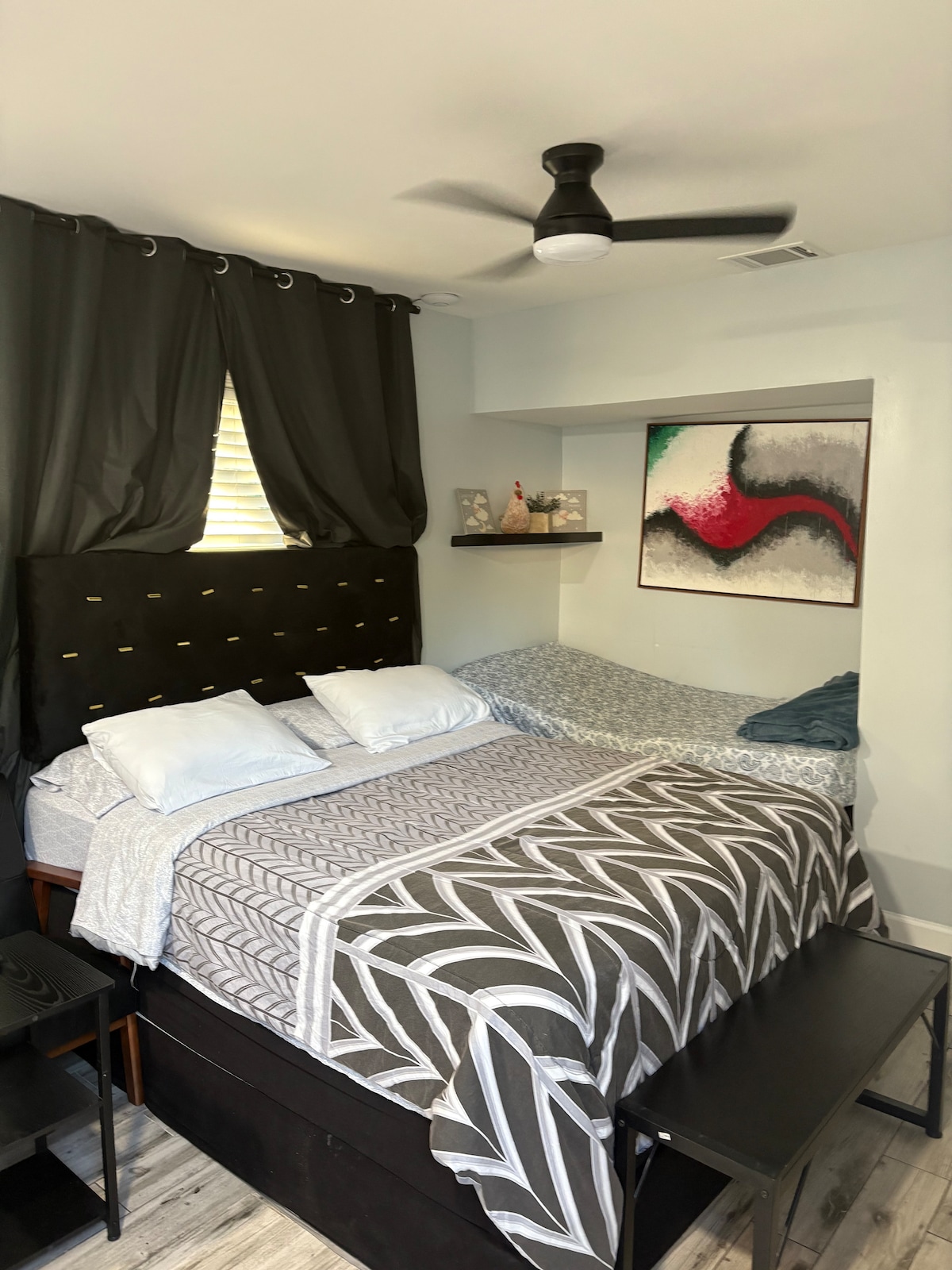 Step into our Moroccan-inspired oasis! Luxuriate in this beautifully appointed efficiency featuring a King bed, private en-suite bath, coffee station, and mini fridge. Enjoy entertainment on the 55-inch TV with HBO+, Apple TV, Prime, Disney, and more, plus high-speed internet. Coming Fall : a luxurious pool, hot tub, outdoor kitchen, and more. This space can also be booked as part of our larger 2-bed \ 2 bath, or as a 3 bed\ 3-bath property for larger groups. Your getaway awaits!