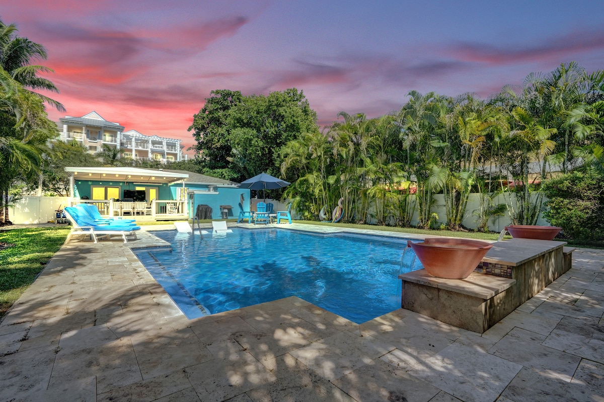 全新4卧室|距离海滩2分钟|热带后院|热水泳池和烧烤