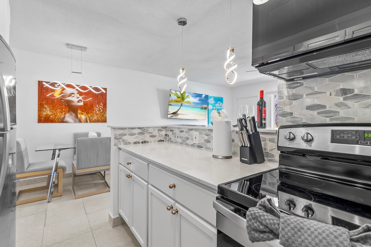 Luxurious Private Studio w/ Private Entrance (440 sq ft- can fit 3 people/2 cars) is attached to our home & 1.7 miles from beach & adjacent to Ft Lauderdale. Park under the covered carport. 1 Queen Bed (& 1 Queen Size-Blow Up Mattress), 1 Bath, Kitchenette, Fiber Optic Wifi, Flat Screen TV (140 channels), Impact Windows, Huge Closet, Fan/light, AC w/ remote, Desk, Chair, fold up/down Table for eating w/ chairs, small Fridge, Microwave, Toaster Oven, Foreman Grill, Hot Plate Stove, Coffee Maker.