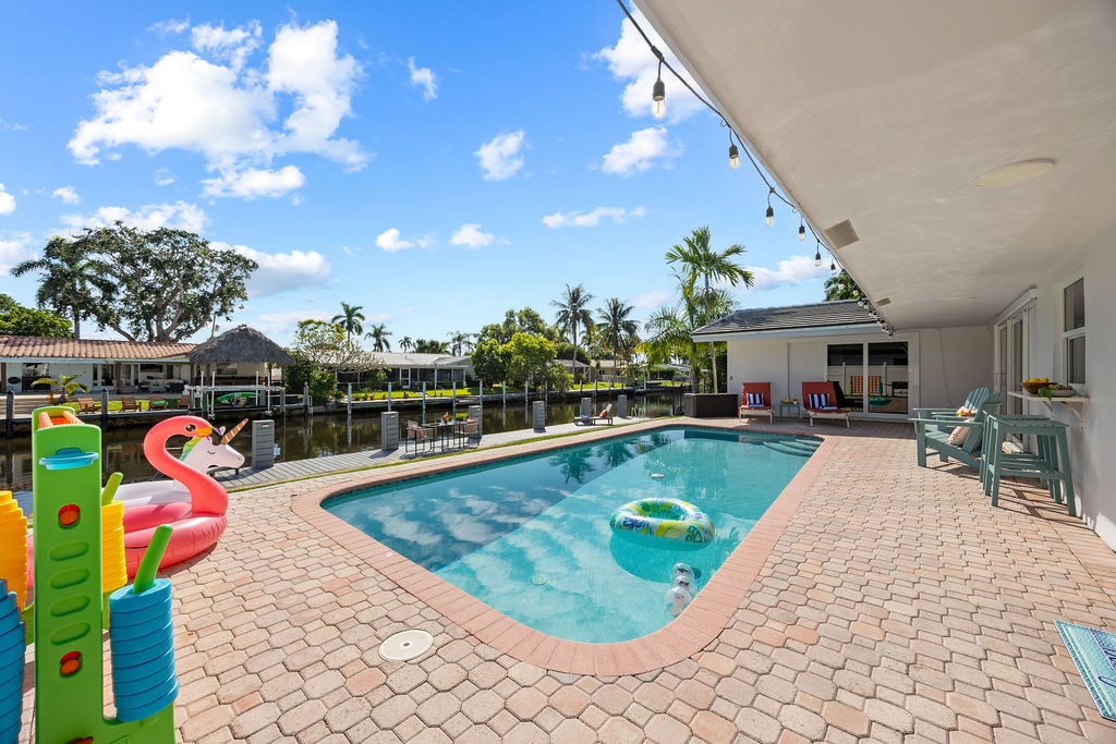☀️ Waterfront 3BR/2BA South Florida home with heated pool, dock and ocean access on a deepwater canal. The highlight is the HUGE private backyard: a wide pool deck, tons of cushioned lounge seating, and a beautiful outdoor dining area that looks straight out over the water. Fire up the BBQ, relax under the palms and watch boats cruise by at sunset. Kayak included. Short drive to Deerfield Beach, Pompano Beach, shopping, restaurants and nightlife. Perfect family-friendly Fort Lauderdale vacation.