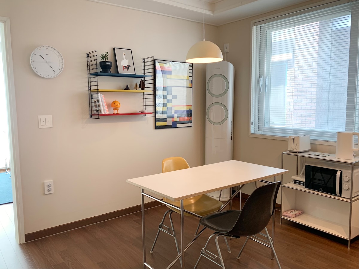 ★Perfect location★ - Gangneung KTX Station : 2min by walk - 5min from Bus terminal by taxi - Easy to go to Beach, Central local market, fancy restaurant etc. - 24h Convenience store(CU) : 5min ★Comfortable stay with 2BR★ - Entire house (60m²), all for yourself - Ground floor (no stair!) - 2 king sized bed & high quality mattress - Clean linens and towels - Fully-equipped kitchen - A/C and floor heating - Nespresso coffee - ALL NEW interior and plants - Wifi & electronic door lock