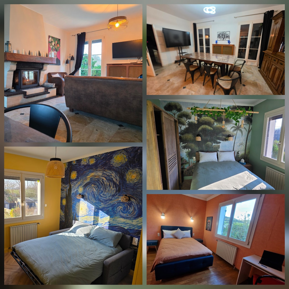 Profitez en couple ou en famille de notre grande maison située en bordure de la forêt. Laissez vous séduire par ces grandes pièces, sa cuisine et sa cheminée pour des soirées près du feu en hiver. Profitez de ces deux terrasses avec salon de jardin l'été. De juin à septembre nous mettons à dispo jacuzzi chaises longues barbecue et hamac. Nous n'autorisons les fêtes, la quiétude du quartier doit être conservé. Nous vous rappelons que la maison fait 100m² et que le jardin 1200m².