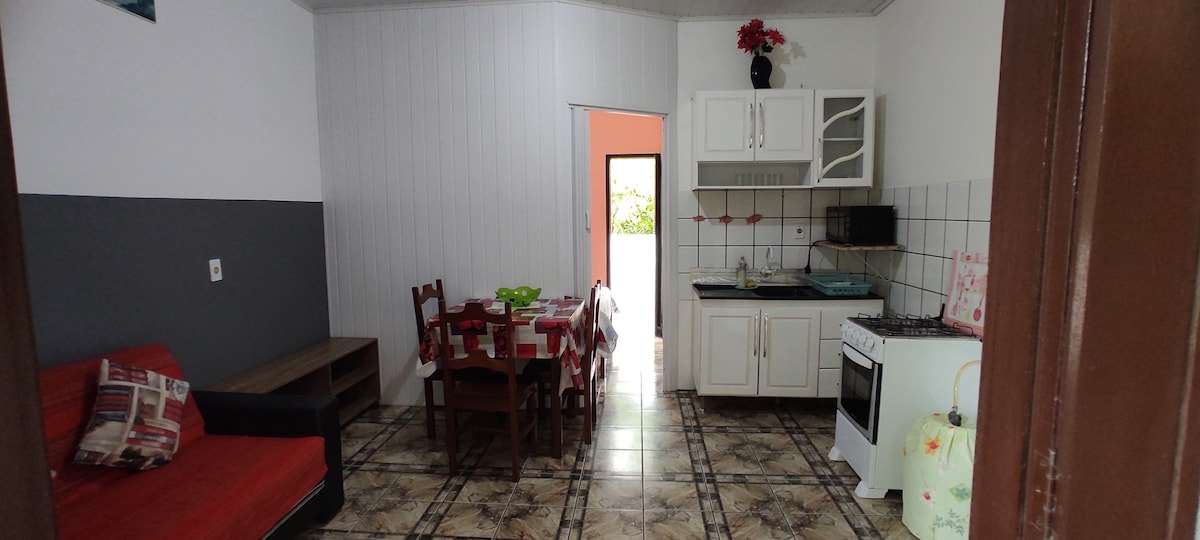 Apartamento térreo, com ótima localização, 2 quartos, sala com sofá cama, cozinha completa. Fica na rua principal de Ponta Das Canas, 200m da praia. Imóvel próximo a várias praias, trilhas e vida noturna. Fica entre dois supermercados, o Oliveira e o Forte. Na rua temos uma pizzaria (40m) e fica a 150m do centrinho. Rua calçada, larga e livre de enchente. Não alaga. Estacionamento gratuito. Temos cadeiras de praia. Atenção. O ar condicionado é bi partido. Bairro tranquilo. Temos Wi-fi.