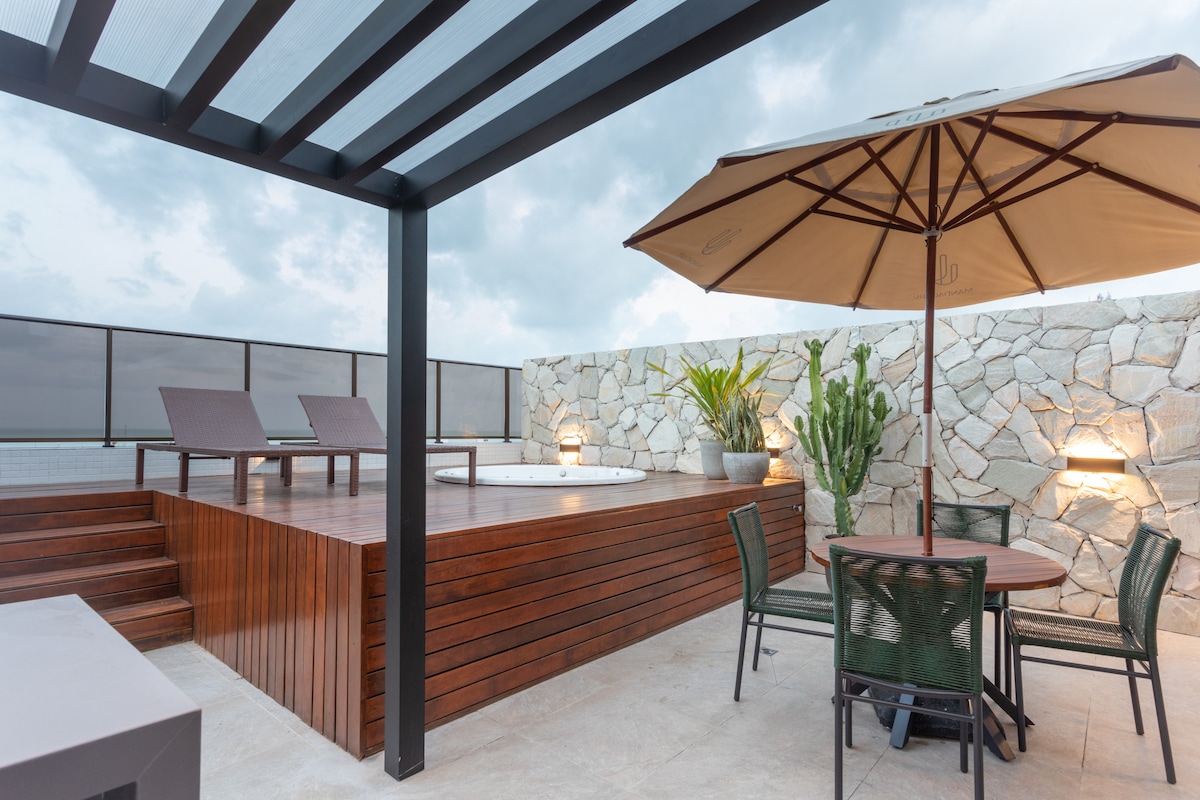 带按摩浴缸、烧烤设施和海景的顶层公寓