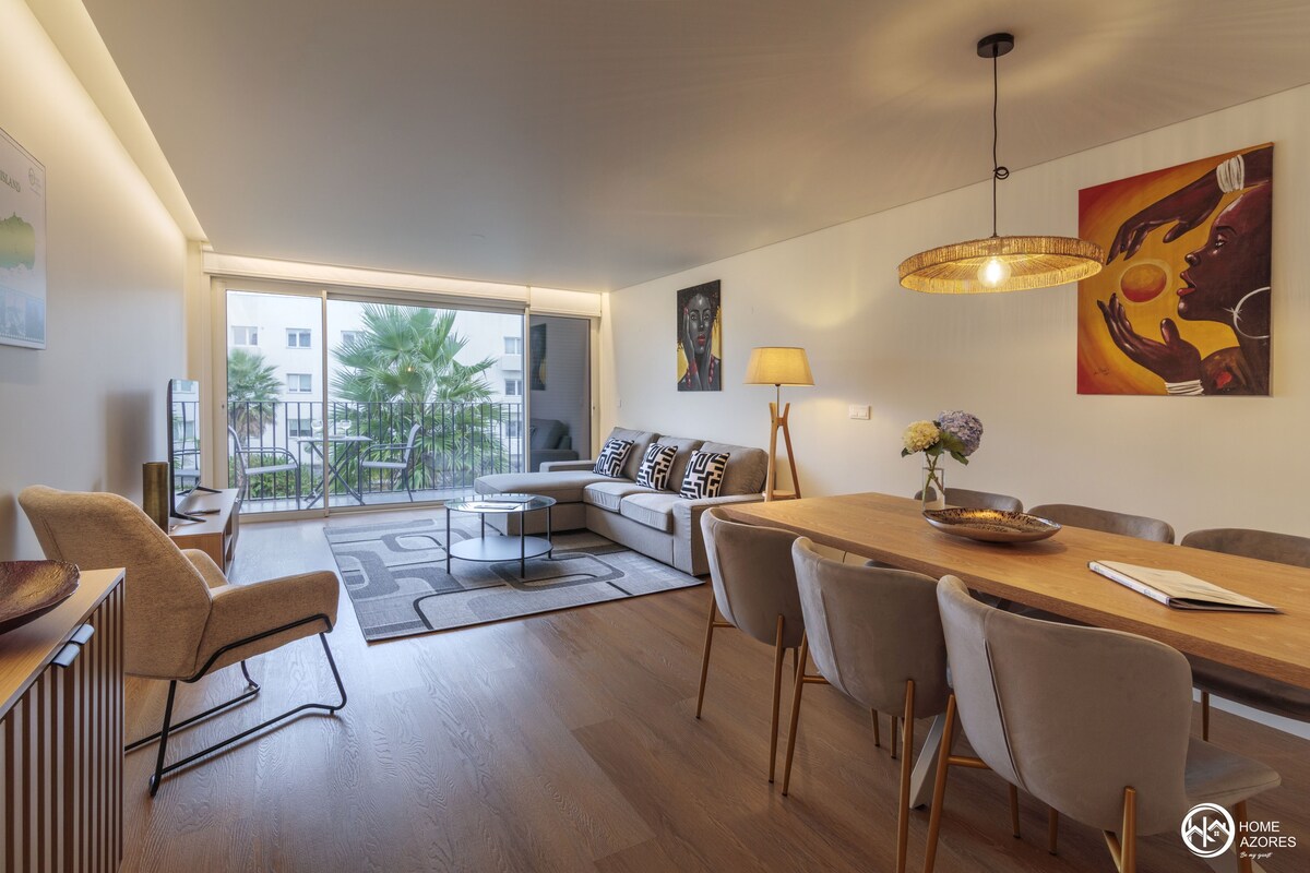 Apartment in the most modern and recent private condominium in the Ponta Delgada Center, next to the emblematic Coliseu of the City, with all the amenities for a relaxing and comfortable stay. Space with large areas and a light and modern decor. The Suite and the Balcony are facing west enjoying the view of the interior garden and the magnificent sunsets. It is close to main avenue, pools and downtown. The airport is 5 minutes drive away.
