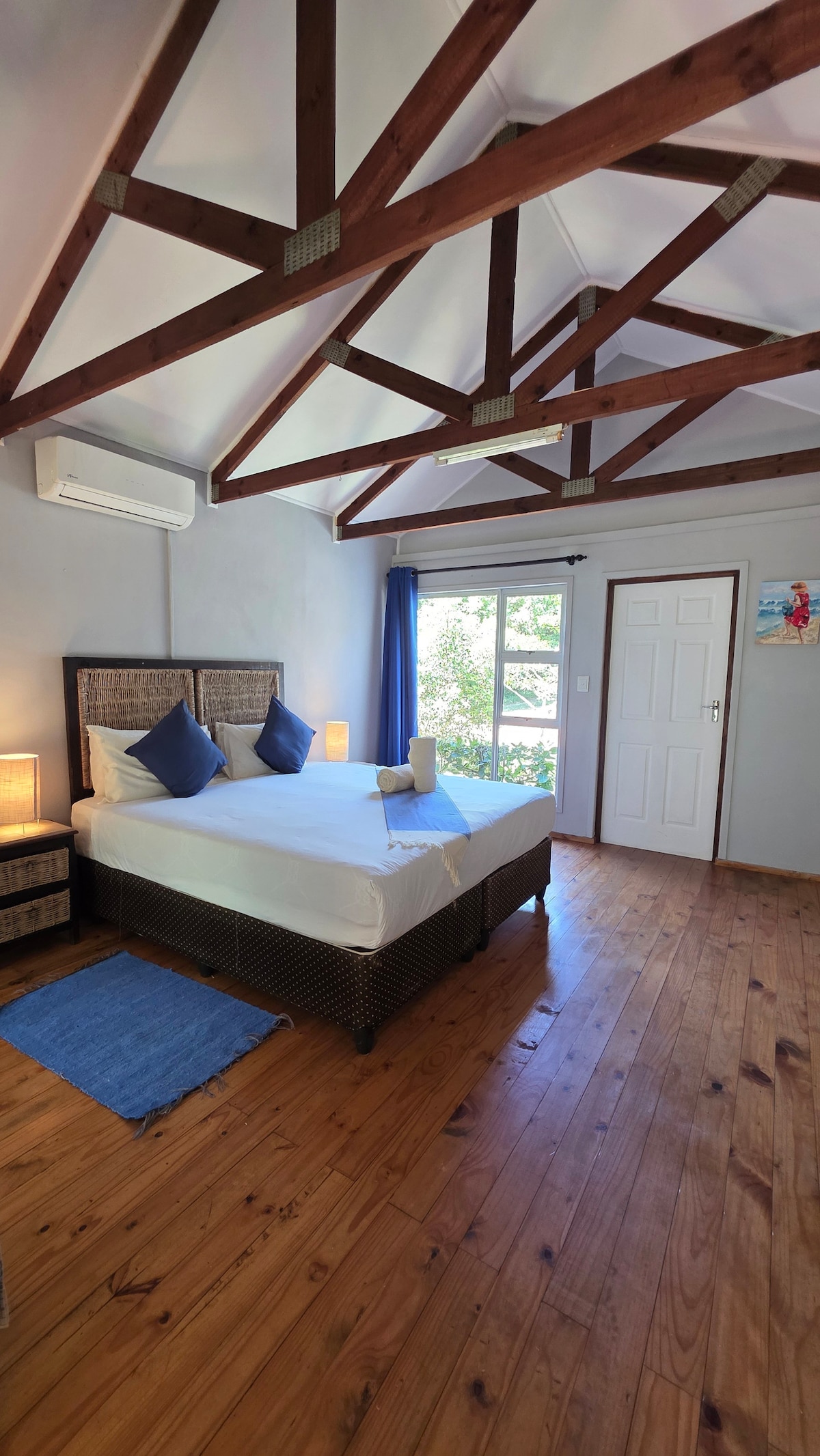 Nestled in a green and peaceful environment, house 10 is located at the top of the dune. The view overlooking the bay is just magic and beautiful and we hope that you will appreciate this outstanding place combining beauty and simplicity truly well preserved nature with trees and birds There is a gas braai , table and chairs on the deck and seating and bedding inside, all for 8 people
