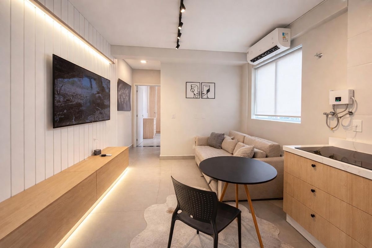 Procurando um lugar para trabalhar, descansar ou explorar a cidade? Nosso apartamento é perfeito para você! Com 2 quartos, Wi-Fi de alta velocidade, espaço de trabalho e um ambiente tranquilo garantem produtividade e relaxamento. Além disso, temos garagem privativa e segurança 24 horas para você ficar tranquilo. A decoração foi cuidadosamente planejada para criar um ambiente acolhedor, com um toque especial: um mapa-múndi na parede que te fará viajar sem sair do lugar. Seja bem-vindo!