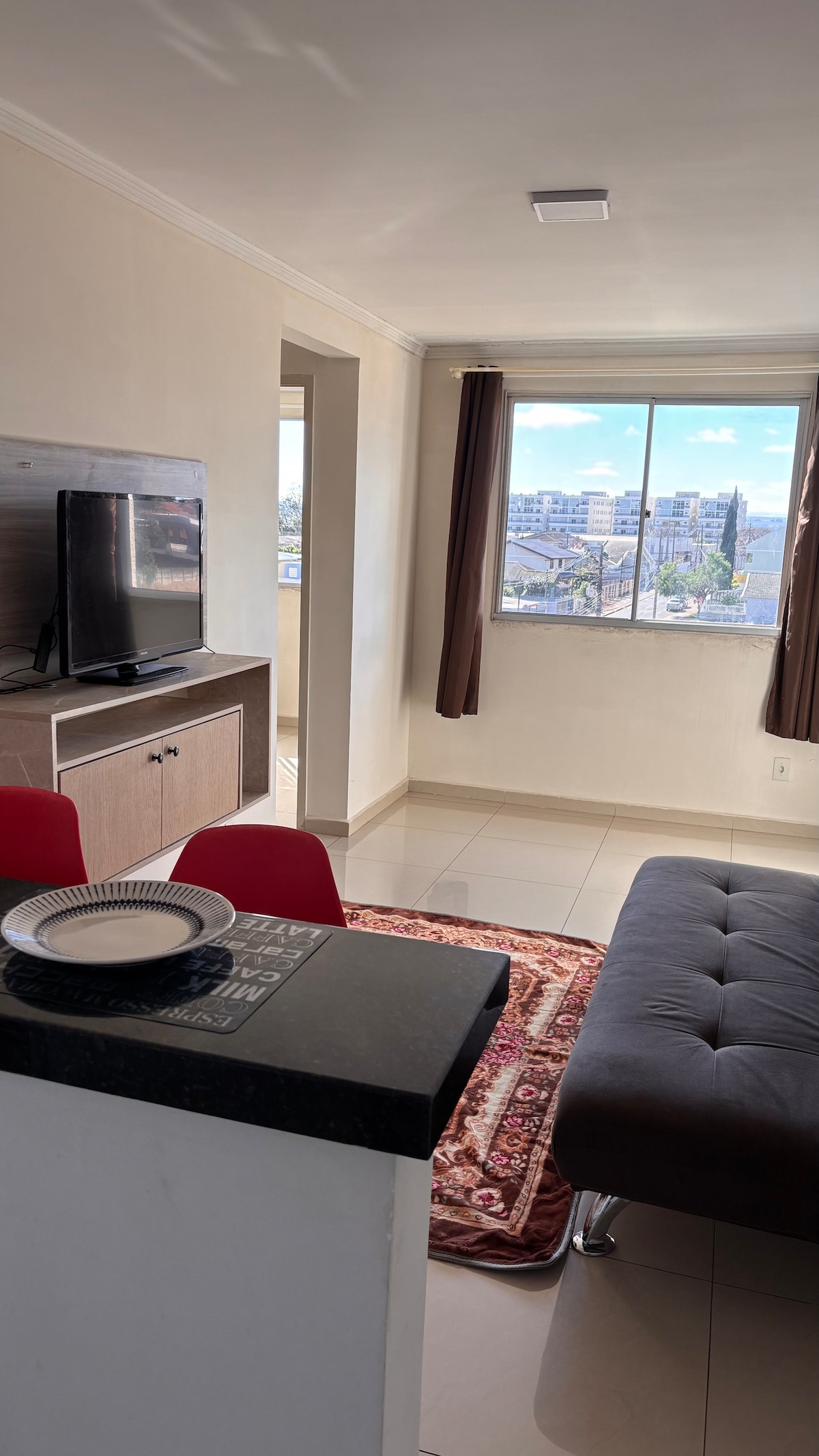 Apartamento totalmente mobiliado, com 2 vagas de garagem, mini escritório, closet, varanda externa, lavanderia e 2 aparelhos de ar condicionado. Roupa de cama e banho. Auto check-in c/ cofre de chaves. Internet wifi. Próximo ao centro de Ponta Grossa - PR. A apenas 500 m da Havan e a 900 m do Shopping Paladium. Obs.: Embora com camas para 7 hóspedes, são apenas dois quartos, devendo 4 pessoas dormir na suite, que possui beliche e cama de casal.