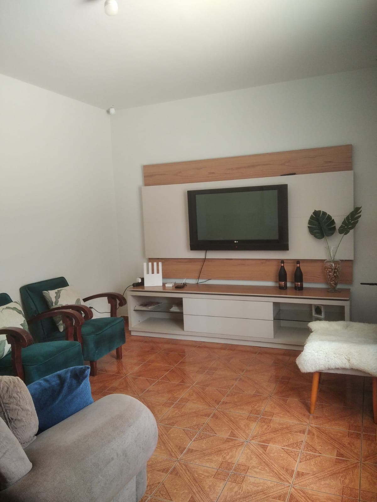 sobrado mobiliado contendo na parte superior 3 quartos sendo uma suíte, banheiro social, e na parte inferior tem cozinha completa, sala de estar com tv, sala de jantar, lavabo, lavanderia, churrasqueira coberta, wifi e uma vaga de garagem com possibilidade de usufruir mais uma vaga na minha propriedade ao lado.