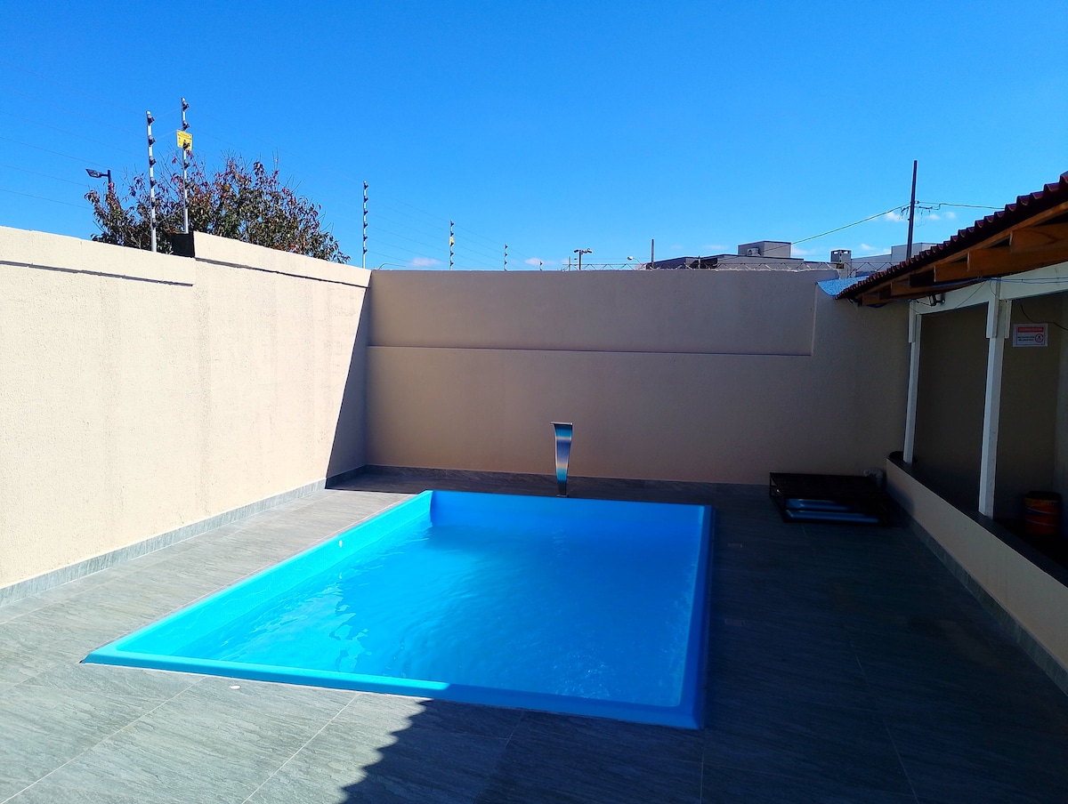 Relaxe com toda a família nesta acomodação tranquila. piscina para adultos e infantil, churrasqueira, 2 quartos com 2 camas de casal 2 guarda roupas, 1 banheiro, sala e cozinha conjugada, sofá retráti, tv smart, wi-fi, geladeira, fogão à gás, fogão de indução, armário e pia interna, tanque, microondas, utensílios ( talheres, pratos , chaleira eletrica, panelas, Airfryer, secador, ferro de passar, 19 cadeiras, 5 mesas de PVC e 1 mesa de madeira,2 espreguiçadeiras.